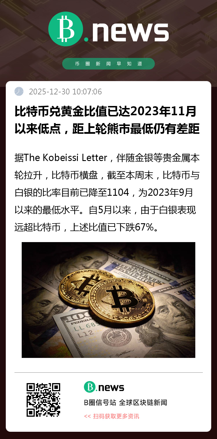 这一比率变化不仅反映了短期资产轮动的态势,也可能预示着市场对宏观经济环境、货币政策预期以及风险偏好的重新评估。投资者正密切关注这些比率的后续走势,以判断比特币与贵金属之间是否会延续当前分化,或再度回归同步波动。(来源:BLOCKBEATS)
