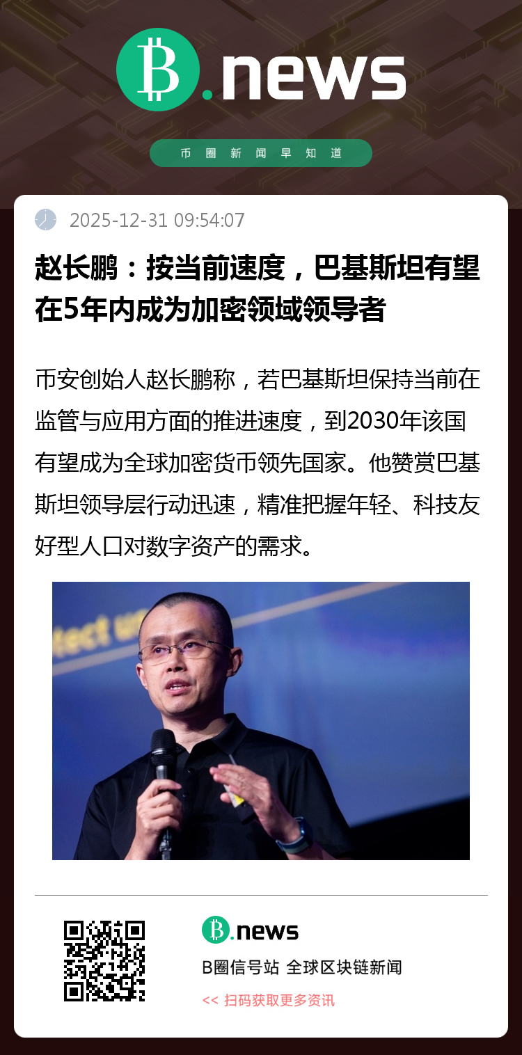 12月31日消息,据Cointelegraph报道,币安创始人赵长鹏称,若巴基斯坦保持当前在监管与应用方面的推进速度,到2030年该国有望成为全球加密货币领先国家。他赞赏巴基斯坦领导层行动迅速,精准把握年轻、科技友好型人口对数字资产的需求。赵长鹏指出,今年巴基斯坦已采取多项关键行动,如成立虚拟资产监管机构、允许币安与HTX合规运营、探索比特币储备,以及推进RWA代币化以吸引外资、提升流动性。