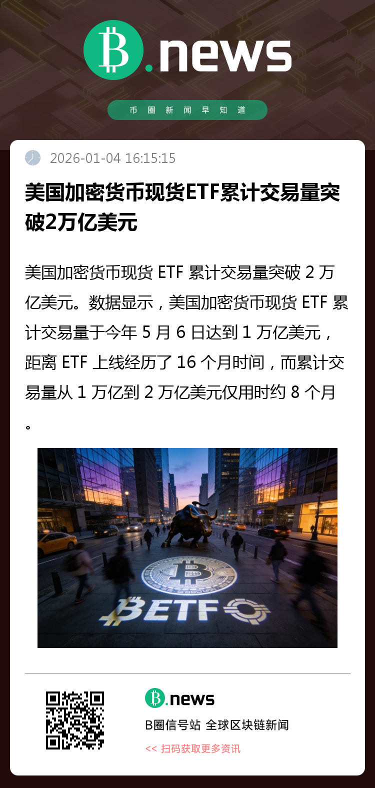 1月4日,据 The Block 报道,美国加密货币现货 ETF 累计交易量突破 2 万亿美元。数据显示,美国加密货币现货 ETF 累计交易量于今年 5 月 6 日达到 1 万亿美元,距离 ETF 上线经历了 16 个月时间,而累计交易量从 1 万亿到 2 万亿美元仅用时约 8 个月。(来源:The Block)