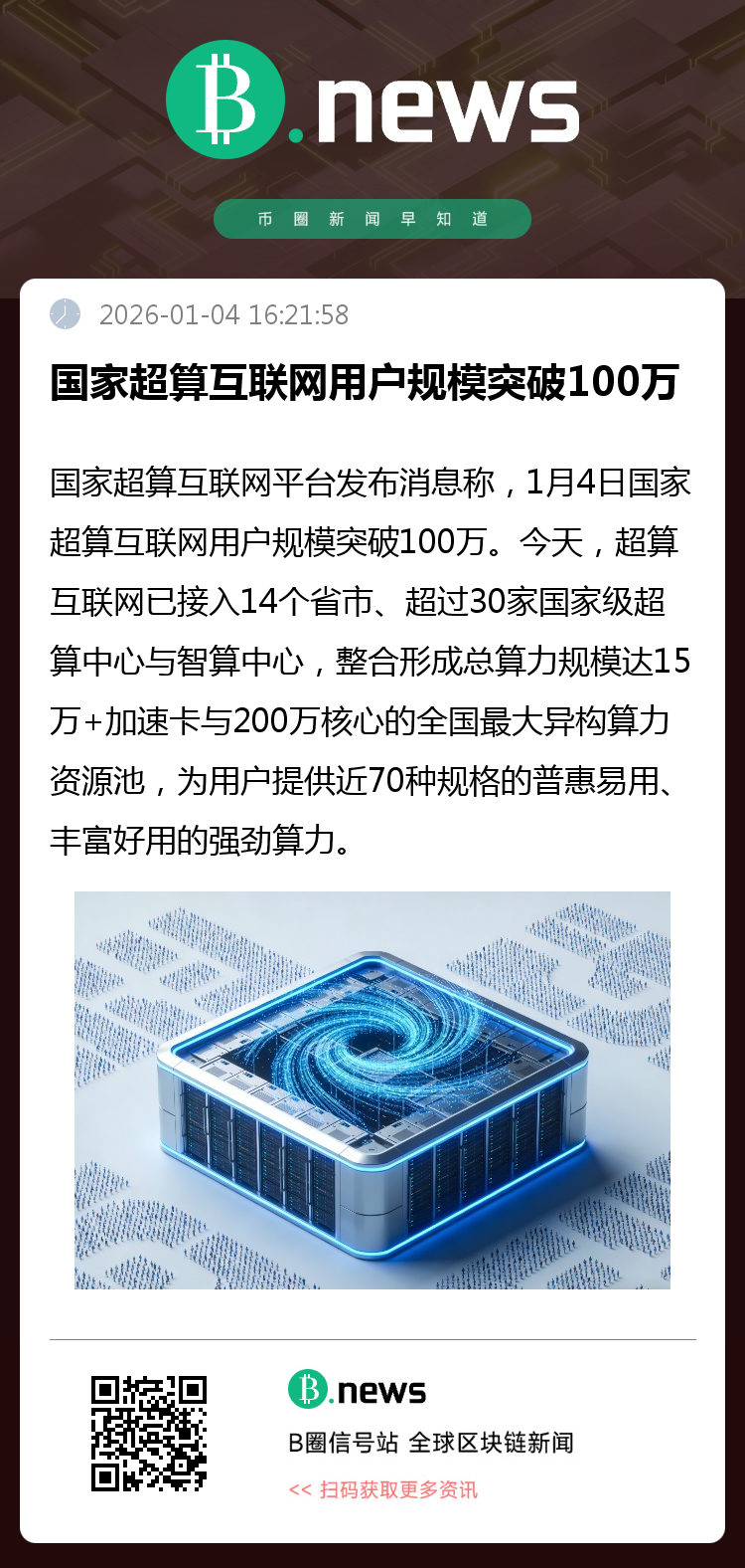 1月4日消息,国家超算互联网平台发布消息称,1月4日国家超算互联网用户规模突破100万。今天,超算互联网已接入14个省市、超过30家国家级超算中心与智算中心,整合形成总算力规模达15万+加速卡与200万核心的全国最大异构算力资源池,为用户提供近70种规格的普惠易用、丰富好用的强劲算力。(来源:PANews)