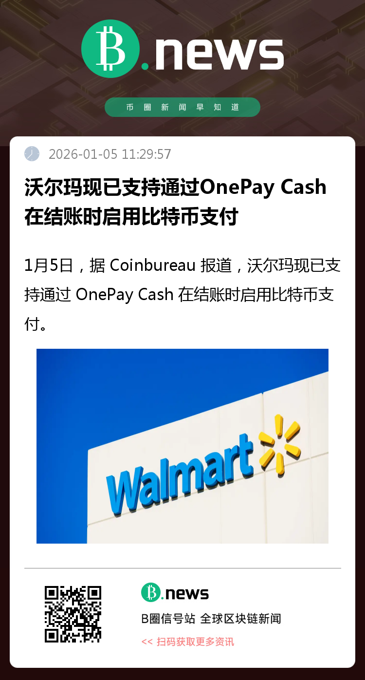 1月5日,据 Coinbureau 报道,沃尔玛现已支持通过 OnePay Cash 在结账时启用比特币支付。(来源:Coinbureau)