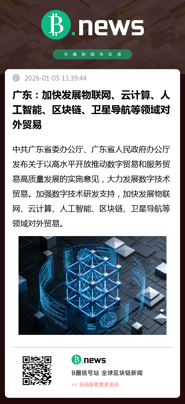 人民财讯1月5日电,中共广东省委办公厅、广东省人民政府办公厅发布关于以高水平开放推动数字贸易和服务贸易高质量发展的实施意见,大力发展数字技术贸易。加强数字技术研发支持,加快发展物联网、云计算、人工智能、区块链、卫星导航等领域对外贸易。拓展国际技术合作网络,支持技术成果转化,对研发中心技术跨境转移给予便利化安排。支持设立粤澳横琴国际先进技术应用推进中心,对接澳门、葡语系国家和其他境内外重要科研机构、高等学校、创新型领军企业和创新联合体等,吸引具有全球竞争力的科技型企业入驻横琴粤澳深度合作区。发展绿色技术和绿色服务贸易,鼓励节能降碳、环境保护、生态治理等技术和服务进口,扩大绿色节能技术和服务出口,加强绿色技术国际合作。(来源:人民财讯)