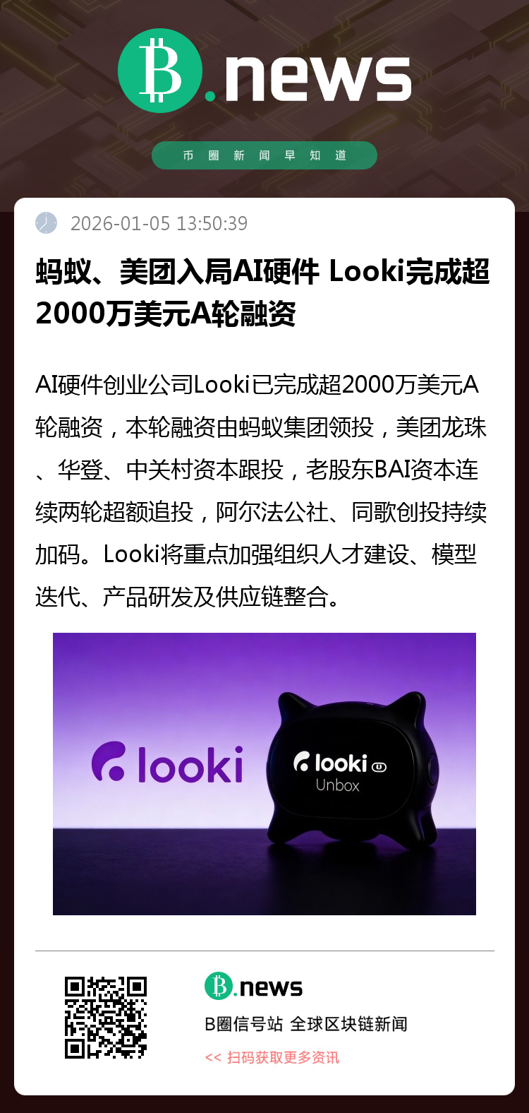 AI硬件创业公司Looki已完成超2000万美元A轮融资,本轮融资由蚂蚁集团领投,美团龙珠、华登、中关村资本跟投,老股东BAI资本连续两轮超额追投,阿尔法公社、同歌创投持续加码。Looki将重点加强组织人才建设、模型迭代、产品研发及供应链整合。 (Founder Park)