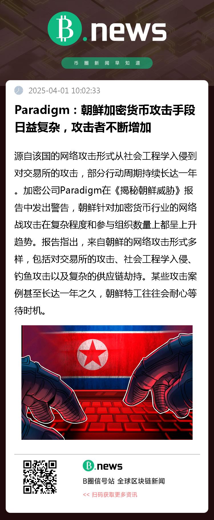 加密公司Paradigm在《揭秘朝鲜威胁》报告中发出警告,朝鲜针对加密货币行业的网络战攻击在复杂程度和参与组织数量上都呈上升趋势。