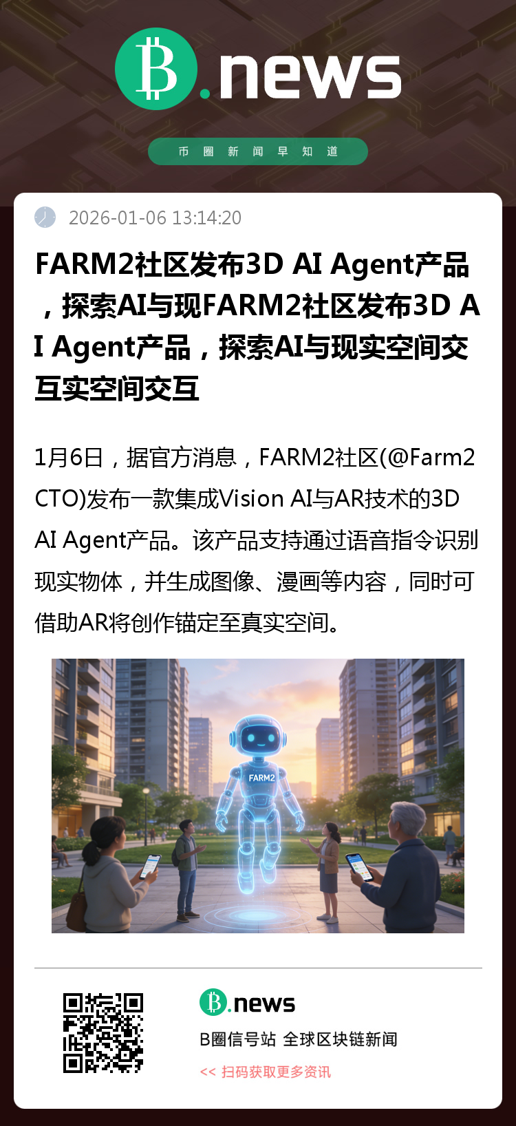 1月6日,据官方消息,FARM2 社区(@Farm2CTO)正式推出一款融合 Vision AI 与增强现实(AR)技术的 3D AI Agent 产品。该产品具备通过语音指令识别现实世界中物体的能力,并可根据识别内容实时生成图像、漫画等多种形式的数字创作。更值得关注的是,用户可借助 AR 技术将生成内容锚定于真实物理空间,实现虚拟与现实的深度融合。