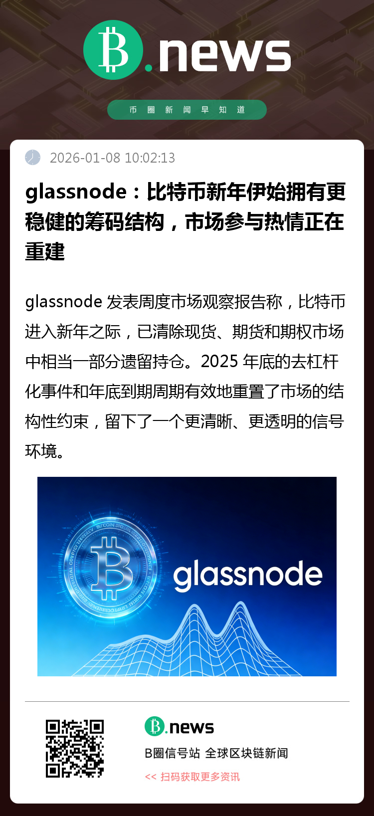 glassnode 发表周度市场观察报告称,比特币进入新年之际,已清除现货、期货和期权市场中相当一部分遗留持仓。2025 年底的去杠杆化事件和年底到期周期有效地重置了市场的结构性约束,留下了一个更清晰、更透明的信号环境。