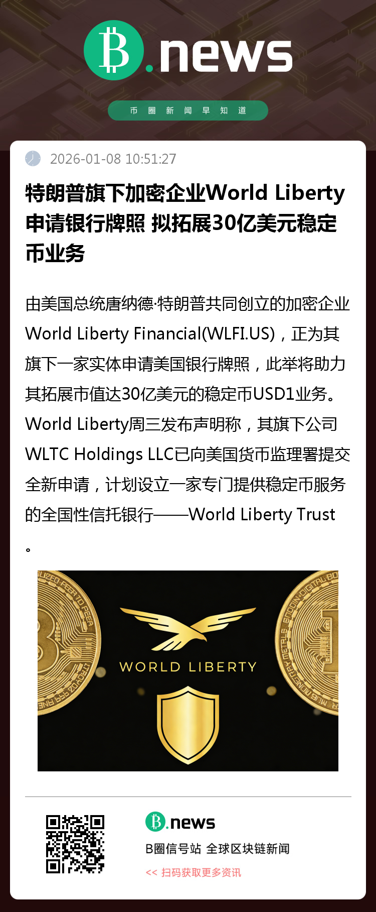 由美国总统唐纳德·特朗普共同创立的加密企业World Liberty Financial(WLFI.US),正为其旗下一家实体申请美国银行牌照,此举将助力其拓展市值达30亿美元的稳定币USD1业务。World Liberty周三发布声明称,其旗下公司WLTC Holdings LLC已向美国货币监理署提交全新申请,计划设立一家专门提供稳定币服务的全国性信托银行——World Liberty Trust。(来源:财联社)