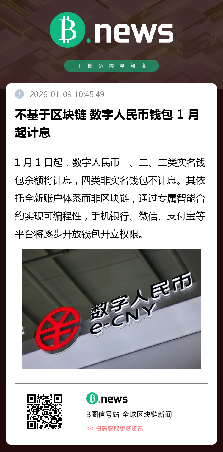 1 月 1 日起数字人民币钱包余额将开始计付利息,据悉其智能合约并不同于因以太坊而闻名、建立在区块链之上的「链上」智能合约。资深数字人民币专家指出,数字人民币并不是建立在区块链上,而是基于一个全新设计的账户体系,央行和商业银行共同维护「同一本账」,通过加载「不影响货币功能的智能合约」,数字人民币实现可编程性,支持定向支付、自动执行等功能。
