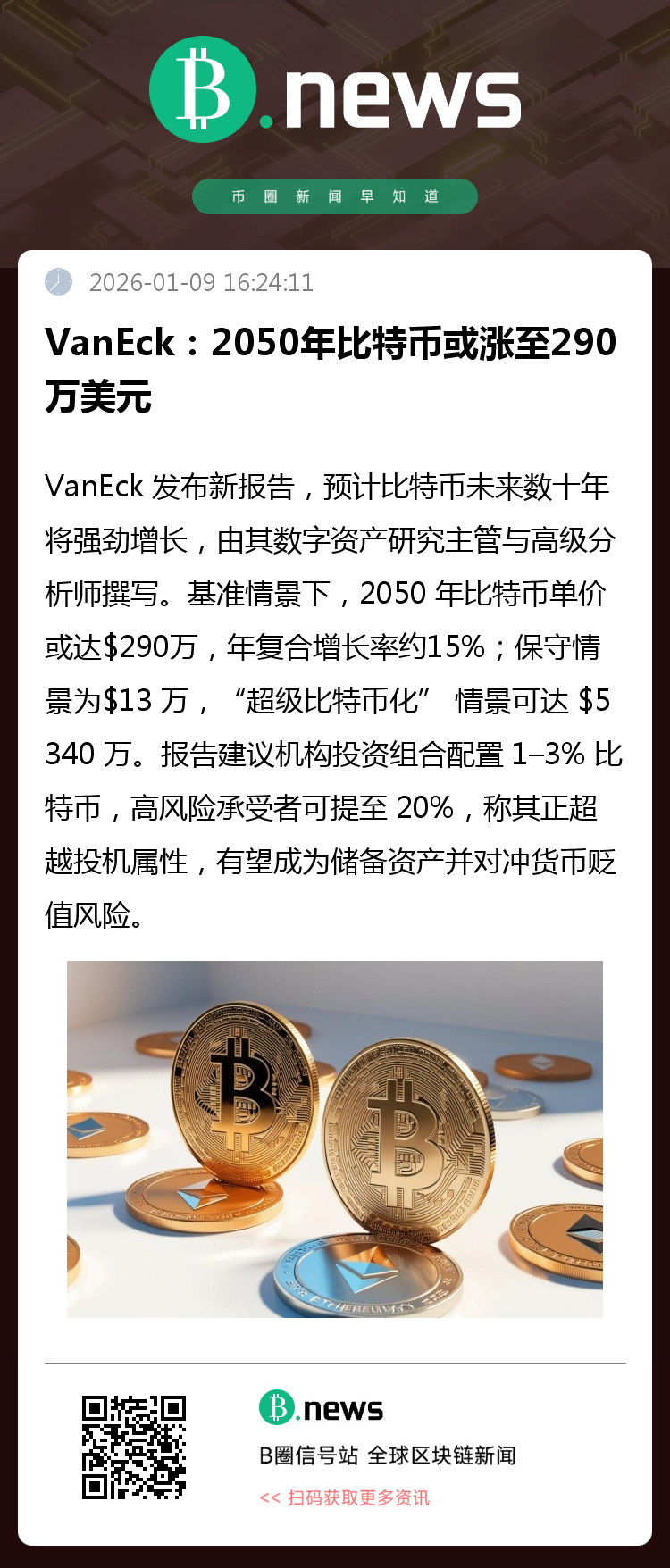 VanEck 发布关于比特币长期资本市场假设新报告,预计未来几十年比特币将迎来强劲增长,并概述机构投资者可能在多元化投资组合中如何配置该资产。报告由 VanEck 数字资产研究主管 Matthew Sigel 与高级分析师 Patrick Bush 撰写,模型显示在基准情景下,比特币到 2050 年每枚将达 290 万美元。