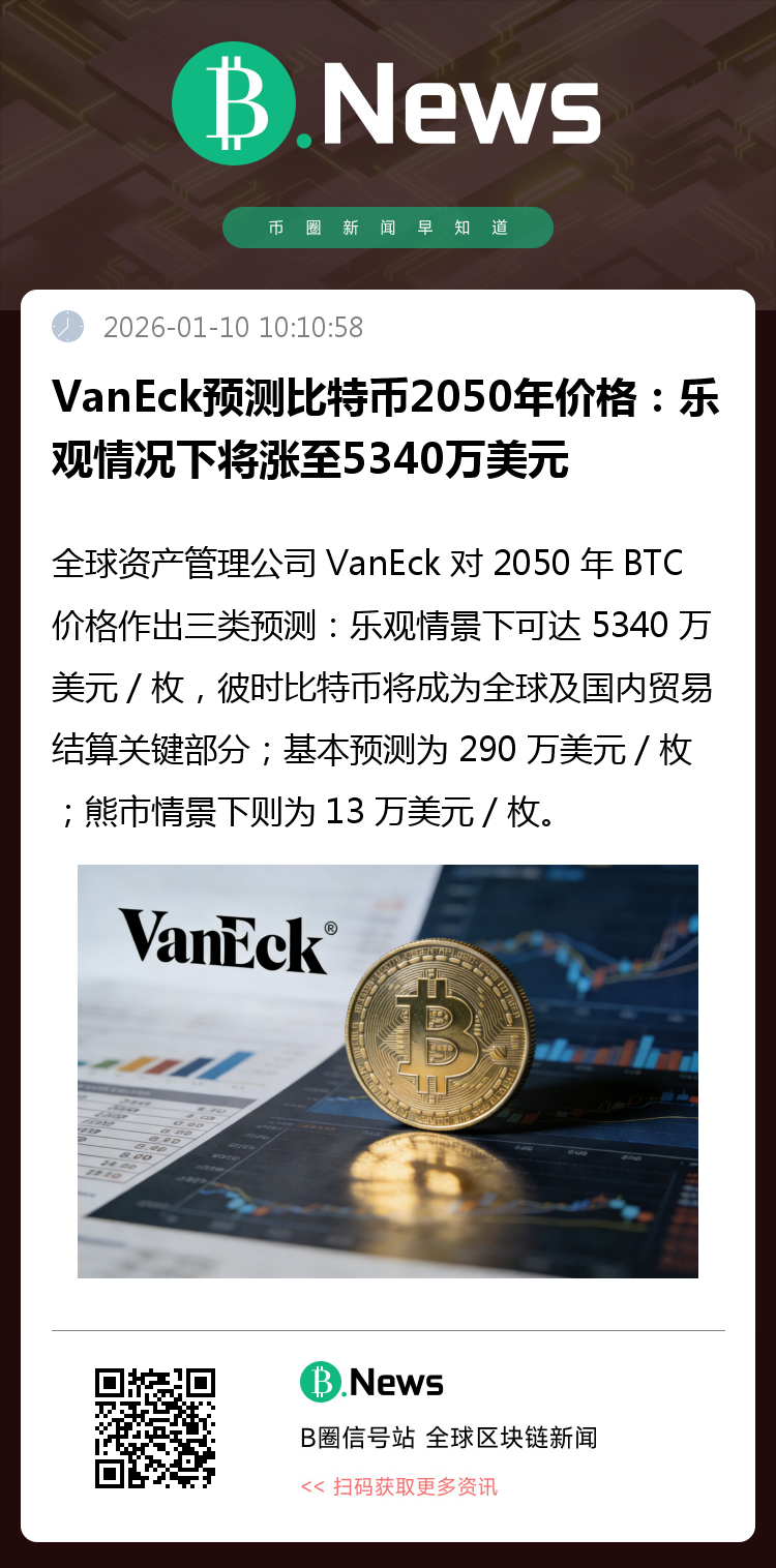 据 Decrypt 报道,全球资产管理公司 VanEck 表示,在较为乐观的预测下,到 2050 年,BTC 的价格可能会达到每枚 5340 万美元。在所谓的“比特币超级化”时期,比特币将成为全球和国内贸易结算的关键组成部分。该公司的基本预测是,到 2050 年,比特币价格将达到 290 万美元;而在熊市情景下,比特币价格仅为 13 万美元。(来源:Decryp)