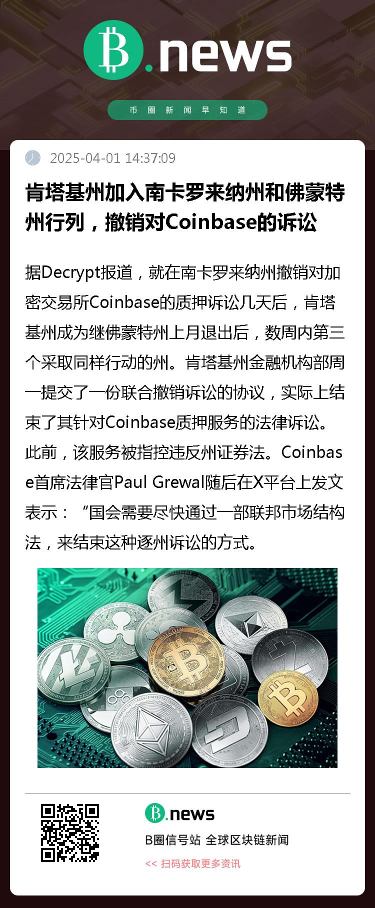 据Decrypt报道,就在南卡罗来纳州撤销对加密交易所Coinbase的质押诉讼几天后,肯塔基州成为继佛蒙特州上月退出后,数周内第三个采取同样行动的州。肯塔基州金融机构部周一提交了一份联合撤销诉讼的协议,实际上结束了其针对Coinbase质押服务的法律诉讼。