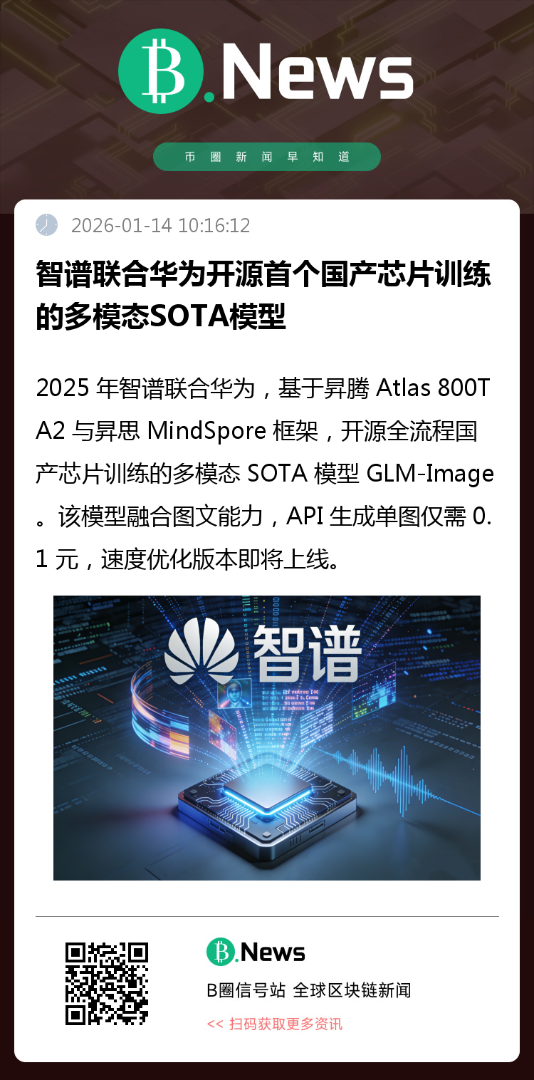 《科创板日报》记者获悉,今天,智谱联合华为开源新一代图像生成模型GLM-Image,模型基于昇腾Atlas 800T A2设备和昇思MindSpore AI框架完成从数据到训练的全流程,是首个在国产芯片上完成全程训练的SOTA多模态模型。据介绍,GLM-Image实现了图像生成与语言模型的联合,API调用模式下,生成一张图片仅需0.1元,速度优化版本即将更新。(来源:财联社)