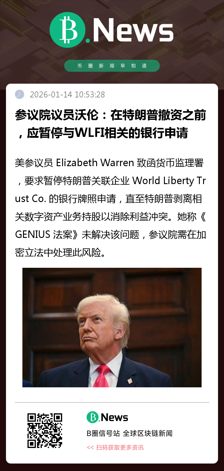 美国参议员 Elizabeth Warren 呼吁暂停 World Liberty Trust Co. 的美国信托银行牌照申请流程,直至特朗普总统剥离其家族在相关数字资产业务中的持股。