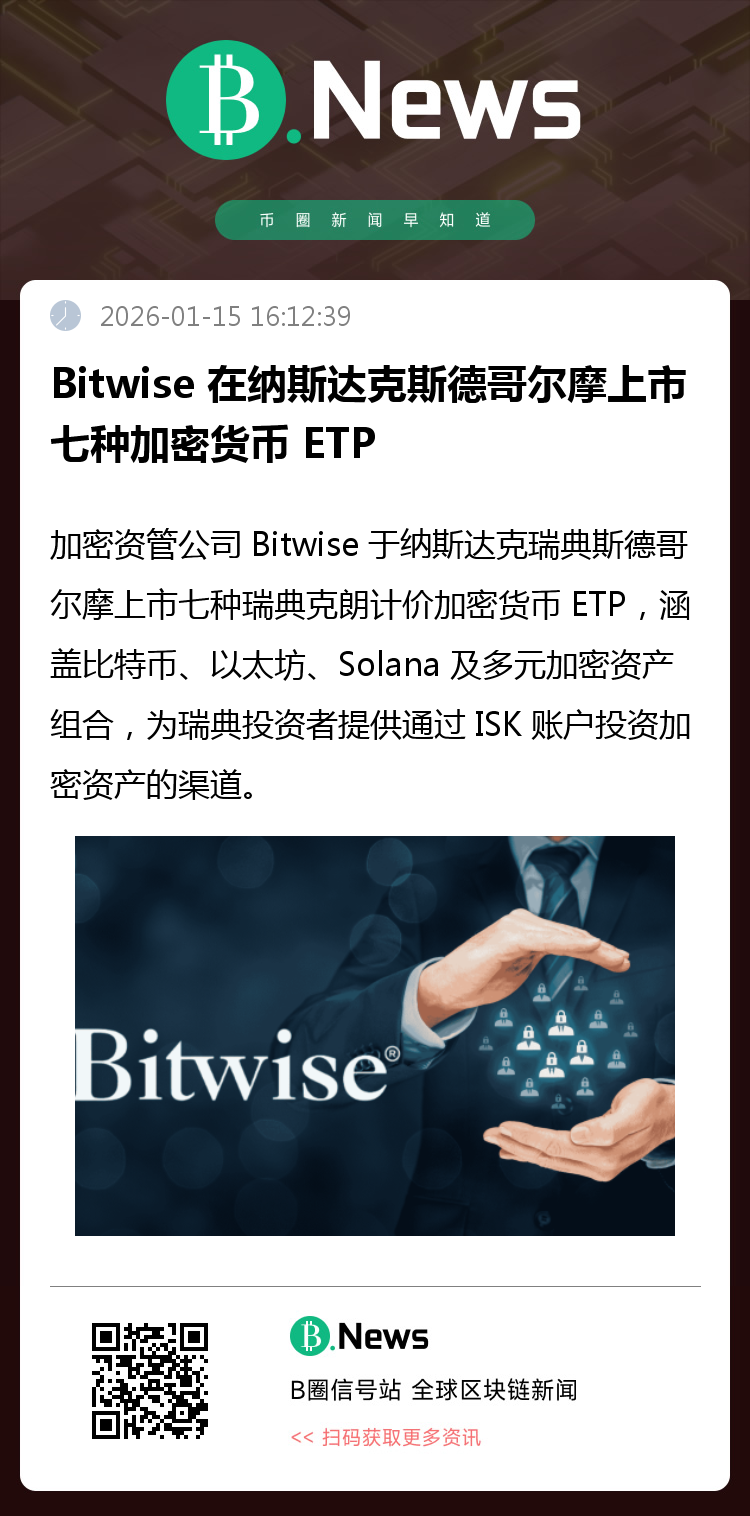 加密资管公司 Bitwise 在纳斯达克斯德哥尔摩上市七种加密货币 ETP。这些以瑞典克朗(SEK)计价的产品包括比特币、以太坊、Solana 及多元化加密资产组合,旨在为瑞典投资者提供通过 ISK 账户投资加密资产的机会。(来源:Foresight News)