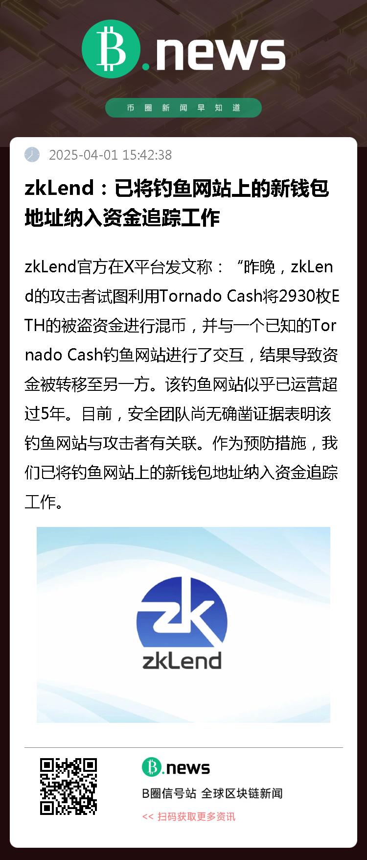 zkLend官方在X平台发文称:“昨晚,zkLend的攻击者试图利用Tornado Cash将2930枚ETH的被盗资金进行混币,并与一个已知的Tornado Cash钓鱼网站进行了交互,结果导致资金被转移至另一方。
