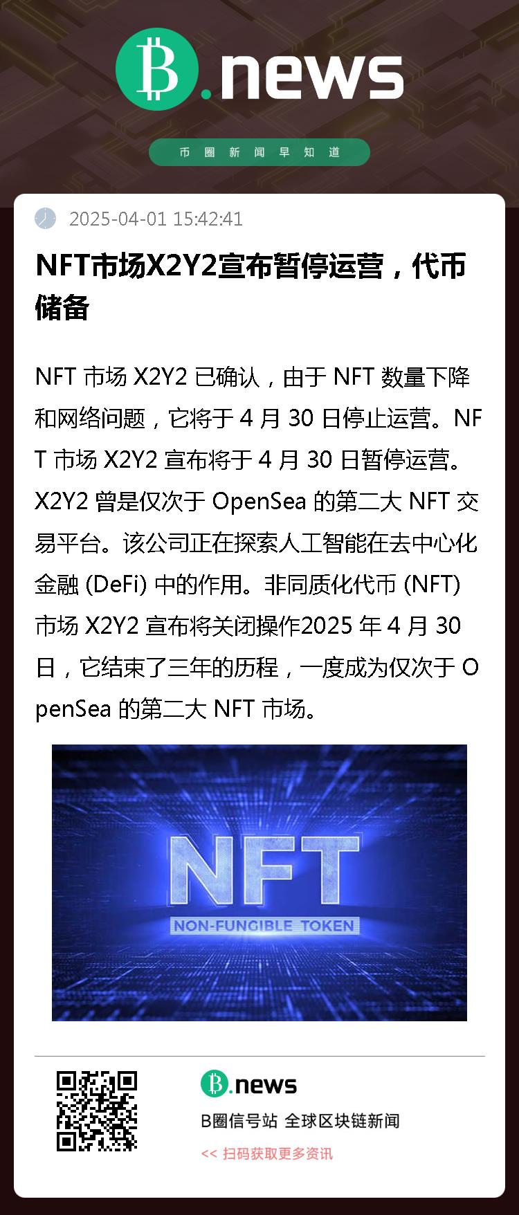 NFT 市场 X2Y2 宣布将于 4 月 30 日暂停运营。