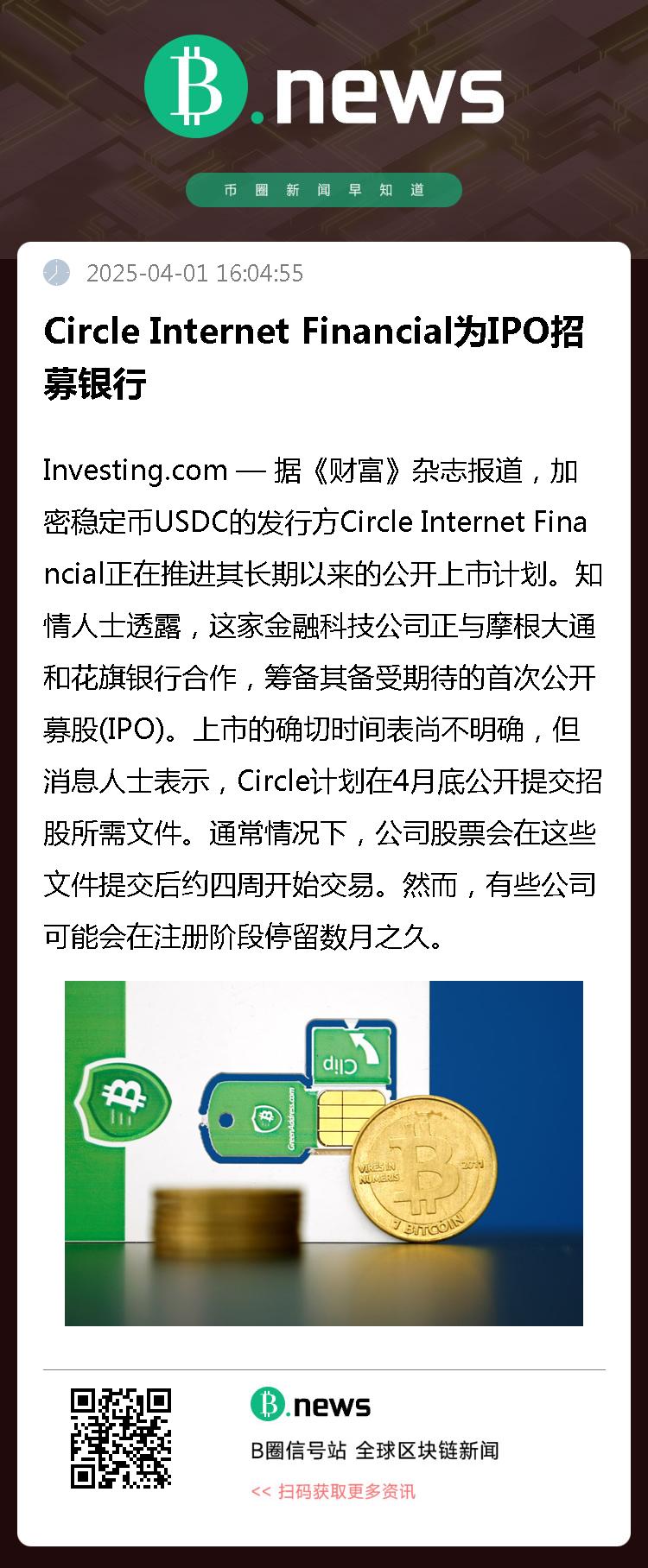 Investing.com — 据《财富》杂志报道,加密稳定币USDC的发行方Circle Internet Financial正在推进其长期以来的公开上市计划。知情人士透露,这家金融科技公司正与摩根大通和花旗银行合作,筹备其备受期待的首次公开募股(IPO)。