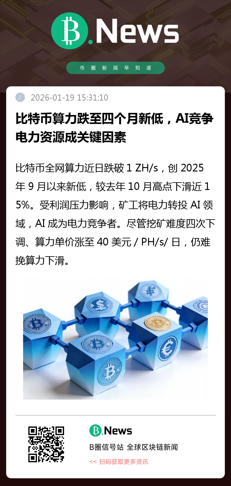 据报道,比特币全网算力近日跌破1 ZH/s(1,000 EH/s),为自2025年9月以来最低。分析指出,矿工因利润压力正将电力资源转投AI与高性能计算领域。尽管挖矿难度自去年11月以来已下调四次,且算力单价近月上涨至每PH/s/日40美元,但整体算力仍自去年10月高点下滑近15%。标准Hash创始人称,AI已成为实际电力竞争者,加剧矿企生存压力。(来源:Cointelegraph)