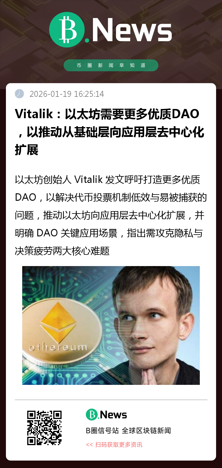 以太坊创始人 Vitalik 发文表示,需要更多但更优质的 DAO,以解决当前代币投票机制的低效和易捕获问题,推动以太坊从基础层向应用层的去中心化扩展。