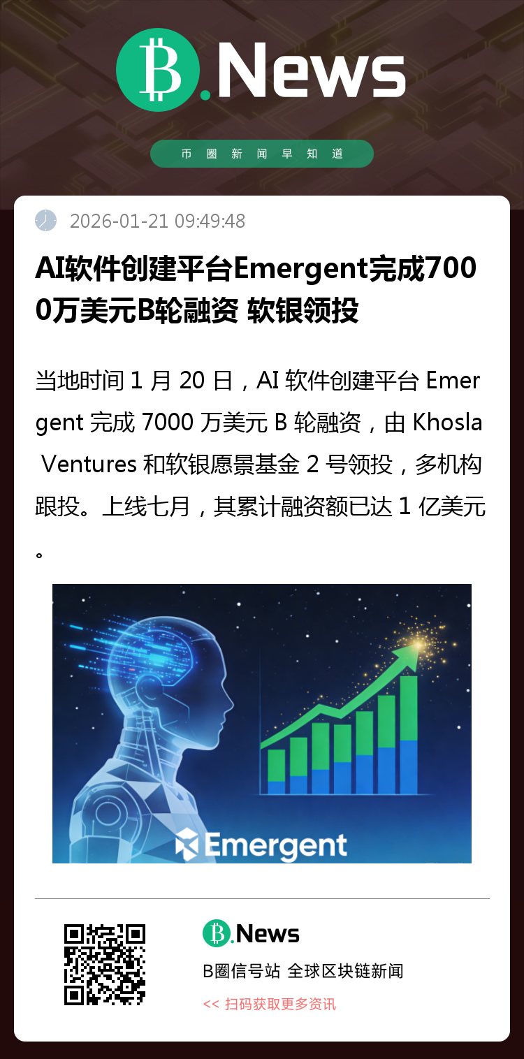AI软件创建平台Emergent当地时间1月20日宣布,完成7000万美元B轮融资。本轮融资由Khosla Ventures和软银愿景基金2号领投,Prosus、Lightspeed、Together及Y Combinator参与投资。自上线七个月以来,Emergent累计融资额已达1亿美元。(来源:财联社)