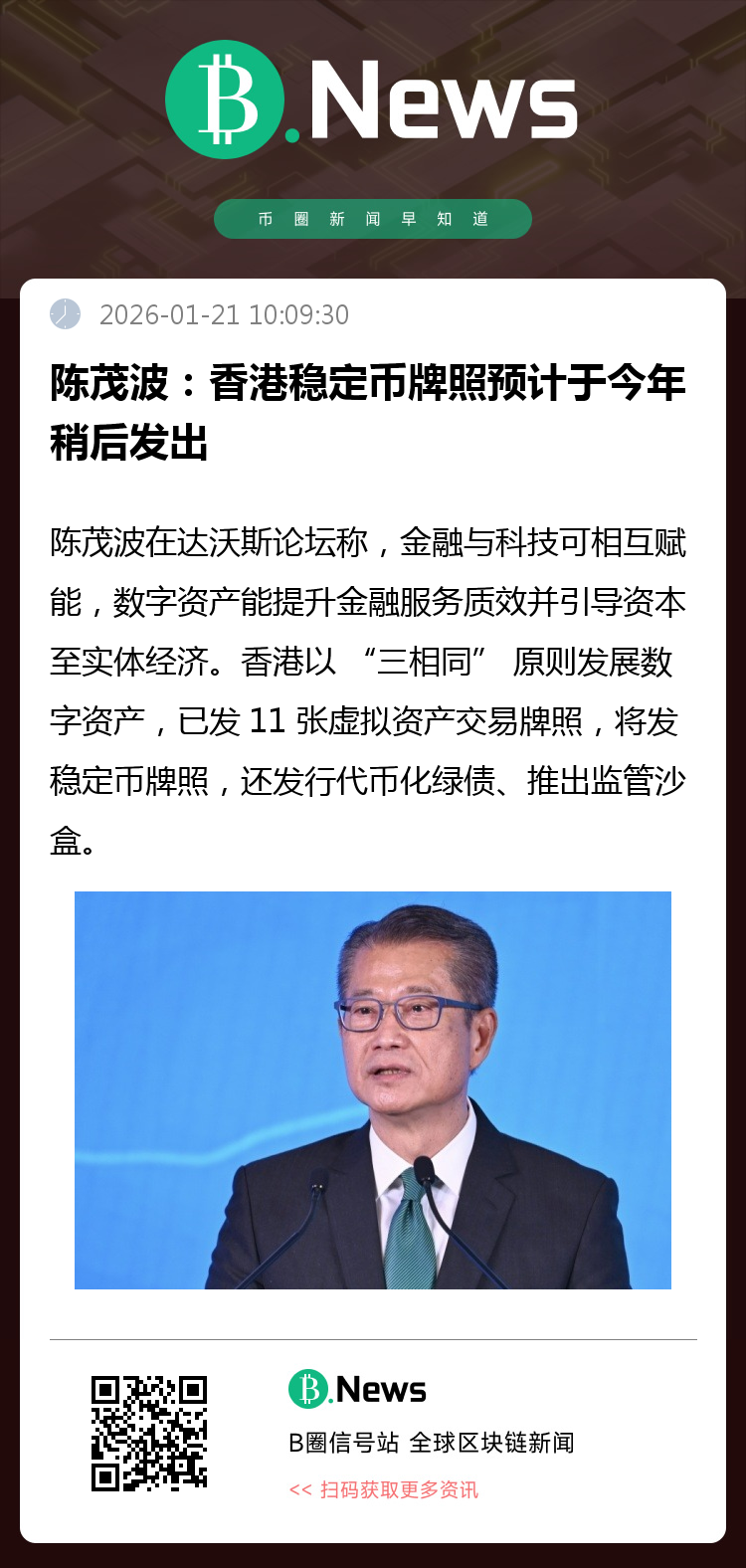 据《香港经济日报》报道,香港财政司司长陈茂波参与达沃斯世界经济论坛年会特别致辞环节表示,金融与科技能相互促进,以数字资产为例,这项金融创新不仅提升金融服务的透明度、效率、包容性和风险管理,亦能更有效将资本引导至实体经济领域;此外,金融亦是支持和赋能科技发展的关键力量。