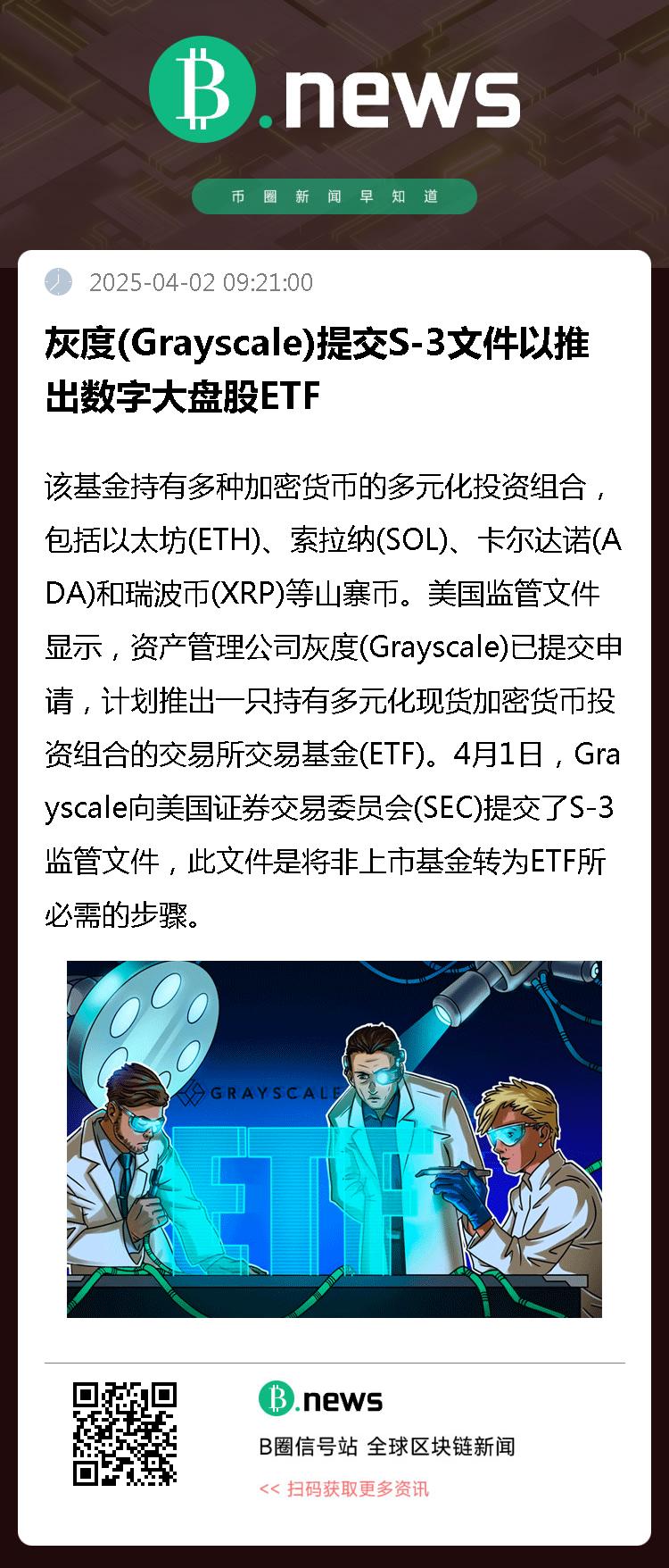 美国监管文件显示,资产管理公司灰度(Grayscale)已提交申请,计划推出一只持有多元化现货加密货币投资组合的交易所交易基金(ETF)。