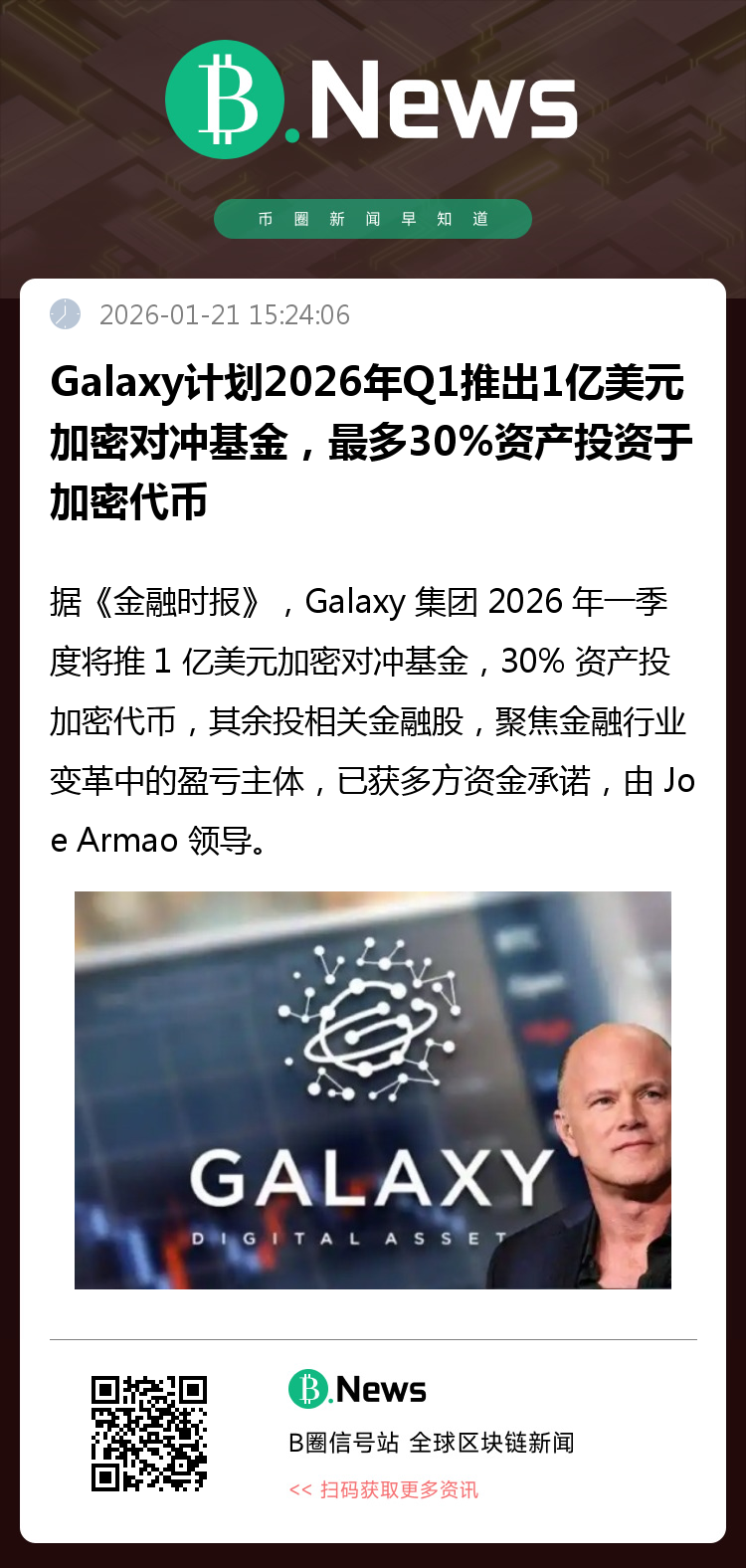 据金融时报报道,Mike Novogratz旗下Galaxy集团计划于2026年第一季度推出规模1亿美元的加密对冲基金,旨在利用市场多空波动获利。该基金将最多30%资产投资于加密代币,其余投向受数字资产技术与监管变革影响的金融服务类股票。目前已获家族办公室、高净值客户与机构承诺资金,Galaxy亦将注资参与。该基金由Joe Armao领导,计划聚焦于金融业中的“赢家与输家”主题,回应数字资产与AI技术带来的深层变革。(来源:金融时报)