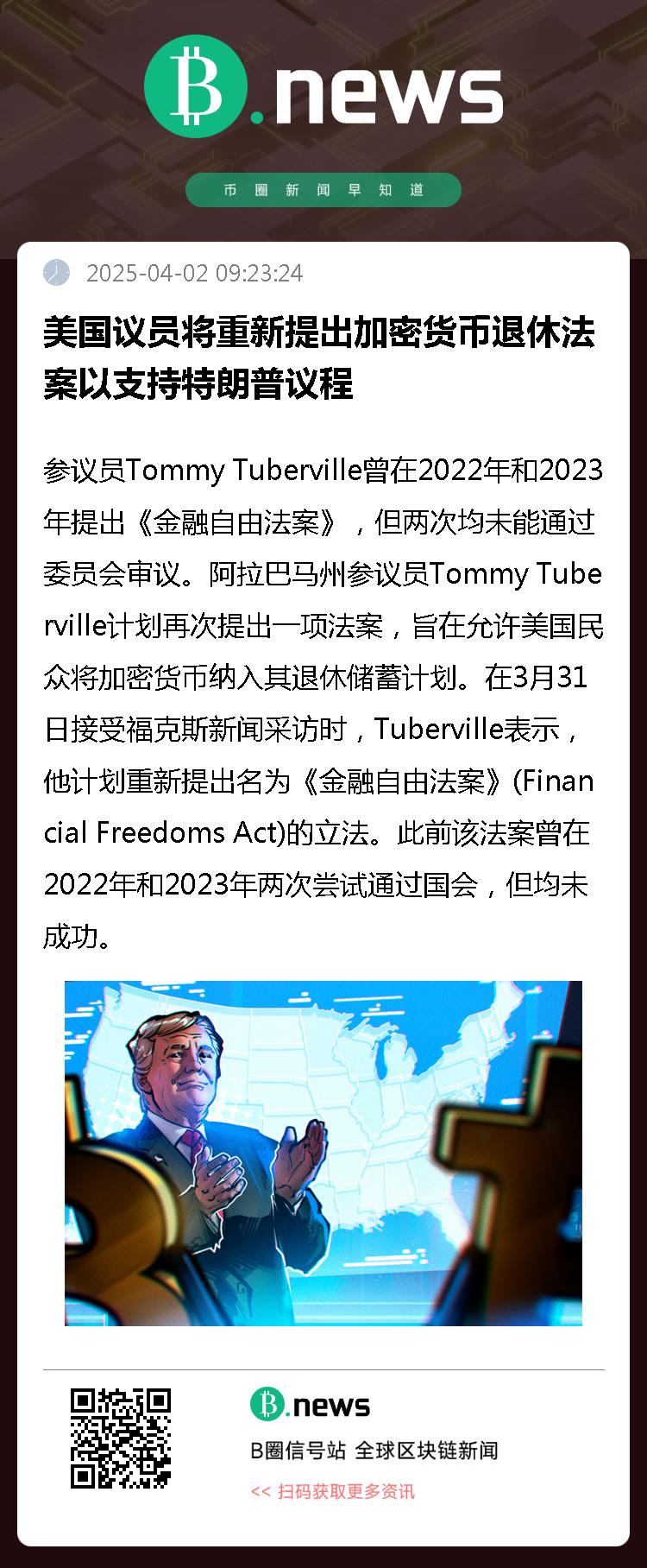 阿拉巴马州参议员Tommy Tuberville计划再次提出一项法案,旨在允许美国民众将加密货币纳入其退休储蓄计划。