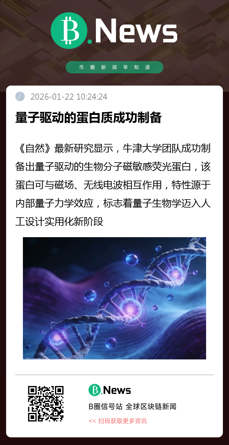 量子生物学迈入人工设计实用化新阶段。据发表于最新一期《自然》杂志的研究,英国牛津大学团队成功制备出一类由量子驱动的蛋白质。这是一种生物分子磁敏感荧光蛋白(MFP),能与磁场和无线电波相互作用,其特性正源于蛋白质内部的量子力学效应。(来源:财联社)