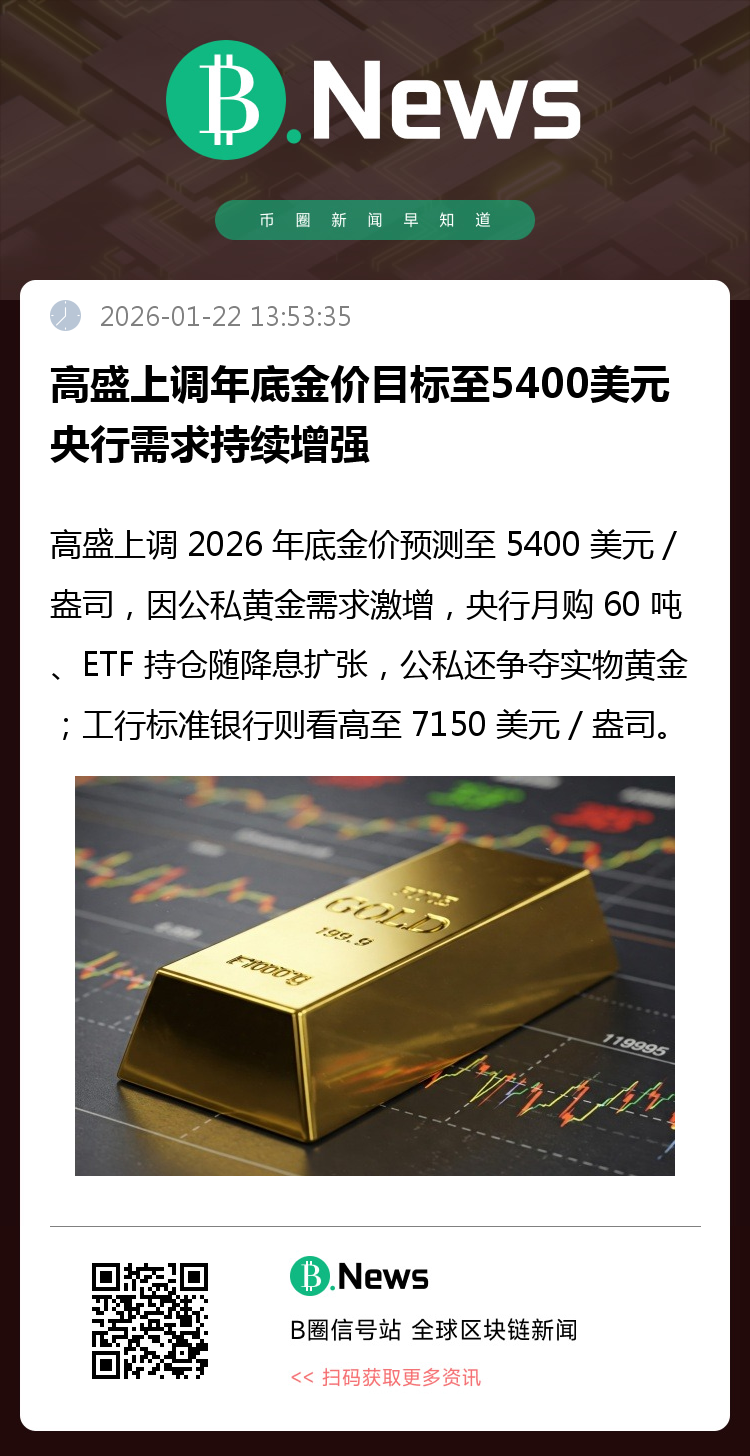 高盛集团将其年底金价预测上调至每盎司5,400美元,理由是来自私人投资者和各国央行的需求持续增强。分析师Daan Struyven等人在报告中写道,将2026年12月的目标价从此前的每盎司4,900美元上调,预计各国央行今年每月将购买60吨黄金,同时随着美联储降息,ETF黄金持仓将继续扩大。他们表示,各国央行“已开始通过传统ETF投资方式,与私营部门投资者争夺有限的实物黄金供应”。报告表示,其假设私营部门多元化投资方会继续持有黄金,他们的购买行为能够抵消全球政策风险,从而推动了价格预测的上行幅度。这些投资者在2026年不会抛售手中的黄金,这实际上提高了价格预测的起始点。工行标准银行高级大宗商品策略师Julia Du认为,黄金价格将上涨至每盎司7,150美元。(来源:金十)