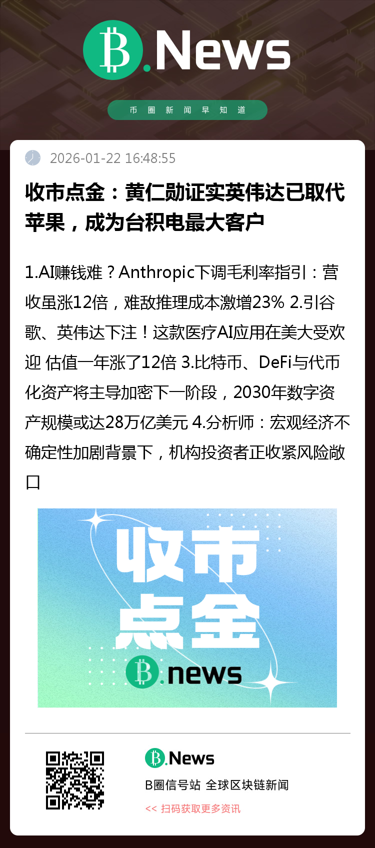 ①英伟达CEO黄仁勋证实英伟达取代苹果成为台积电第一大客户,这标志着全球科技产业链的重大调整;