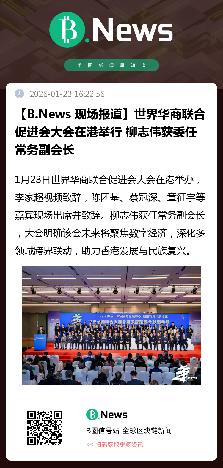 2026 年 1 月 23 日,世界华商联合促进会大会于香港会议展览中心隆重举行。香港特别行政区行政长官李家超通过现场视频连线发表致辞、政务司司长陈团基、世界华商联合促进会主席蔡冠深博士以及世界华商联合促进会会长章征宇等嘉宾现场出席并致辞。
