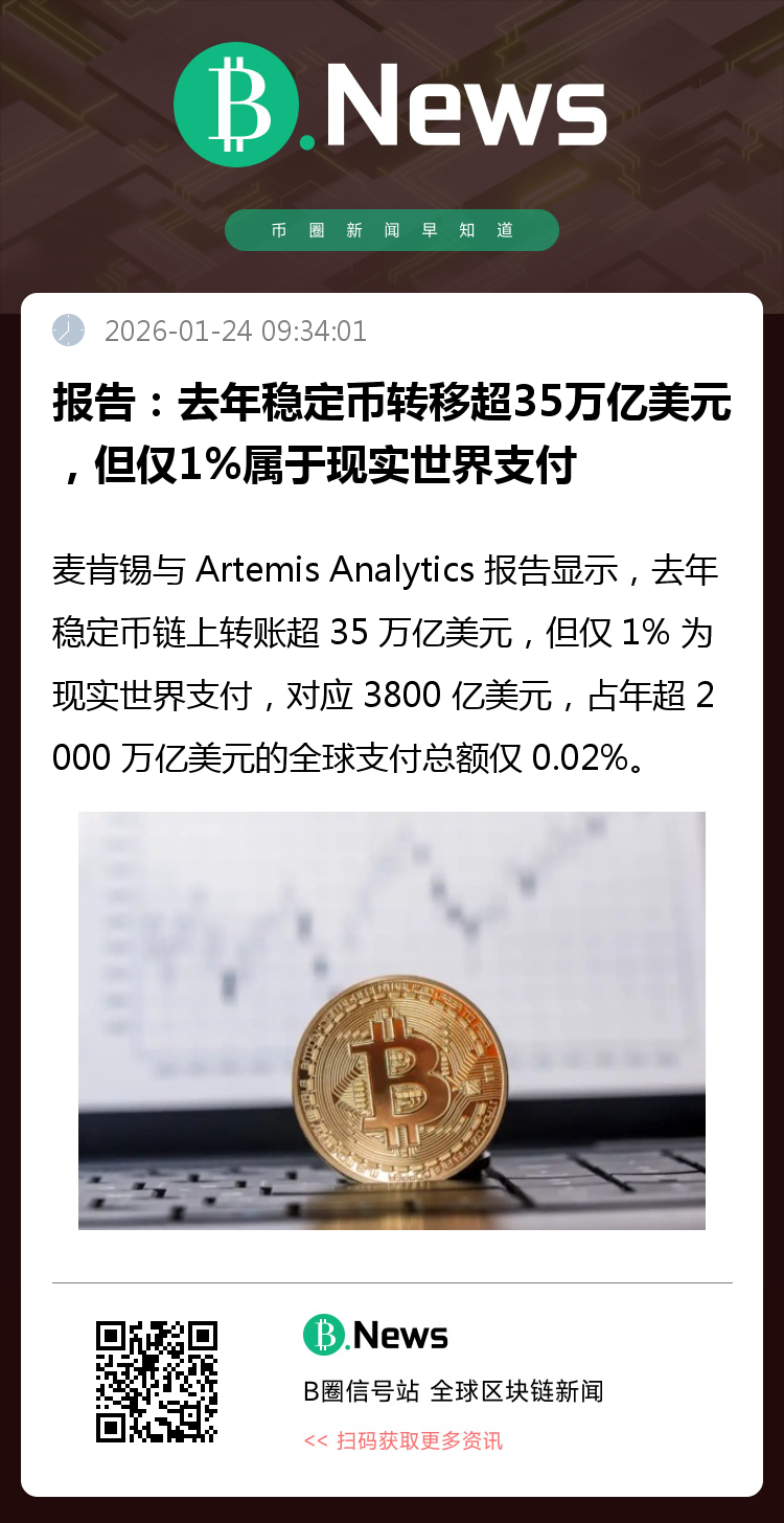 据 Coindesk 报道,咨询公司麦肯锡和区块链数据公司 Artemis Analytics 的一份新报告显示,去年稳定币在区块链上转移了超过 35 万亿美元的资金,但其中只有约 1% 属于现实世界支付。分析估计,只有 3800 亿美元的活动反映了实际支付,例如向供应商付款、汇款或支付工资。约占全球支付总额的 0.02%,而麦肯锡估计全球支付总额每年超过 2000 万亿美元。(来源:Coindesk)