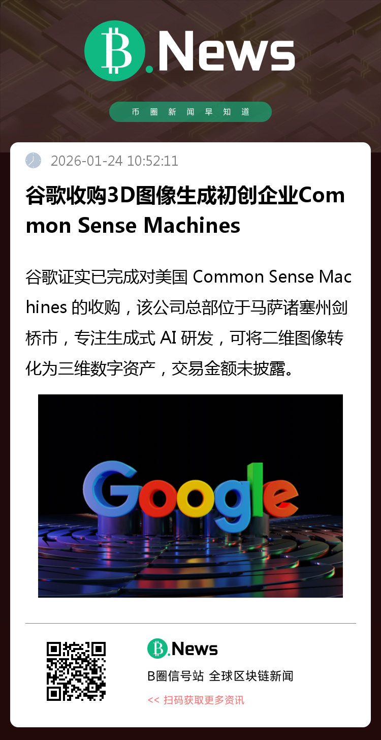 谷歌发言人证实,公司已收购总部位于美国马萨诸塞州剑桥市的Common Sense Machines,该企业主攻生成式人工智能模型研发,可将二维图像转化为三维数字资产。发言人表示,此项交易于本周完成,并未透露收购金额。(来源:财联社)