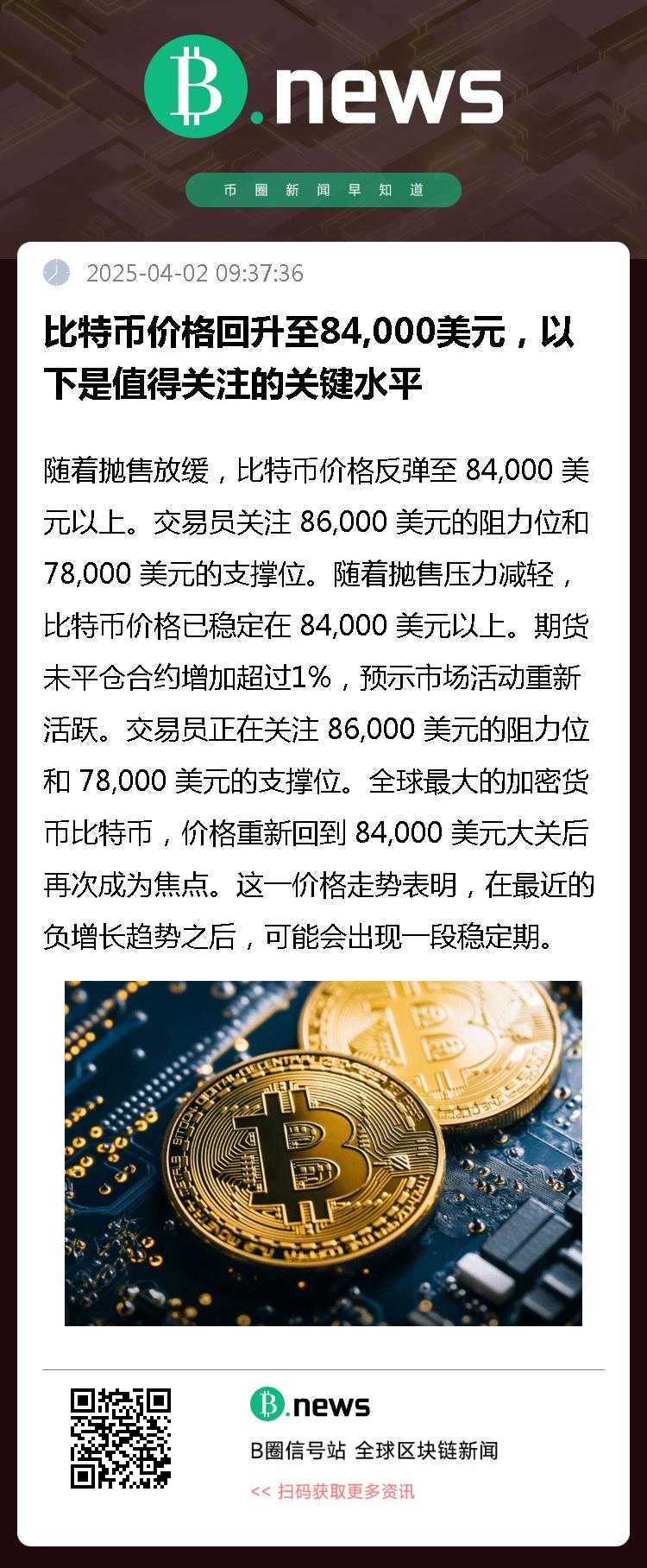 随着抛售放缓,比特币价格反弹至 84,000 美元以上。交易员关注 86,000 美元的阻力位和 78,000 美元的支撑位。