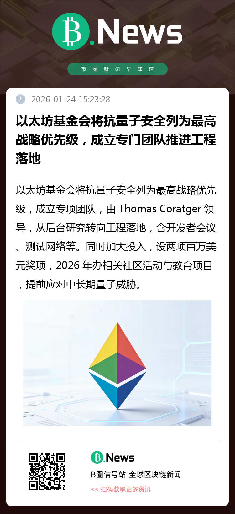 EF 同时加大资金与社区投入,计划推出两项各 100 万美元的密码学奖项,并在 2026 年举办多场抗量子相关社区活动与教育项目。EF 强调,尽管量子威胁仍属中长期风险,但区块链需要提前布局,以确保钱包安全和网络平稳升级。(来源:Coindesk)