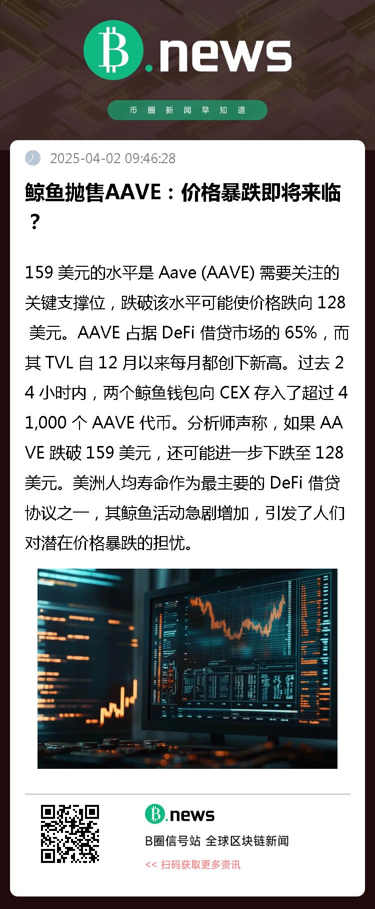 过去 24 小时内,两个鲸鱼钱包向 CEX 存入了超过 41,000 个 AAVE 代币。