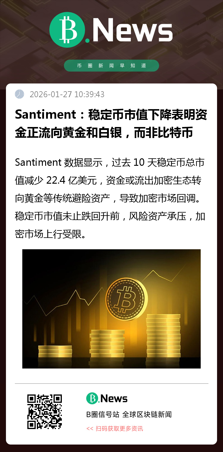 加密分析平台Santiment指出,过去10天内稳定币总市值减少22.4亿美元,可能表明资金正流出加密生态系统,或延缓市场复苏。该机构分析称,这部分资金似乎已转向黄金、白银等传统避险资产,推动其价格创新高,而比特币、整体加密市场及稳定币市值则出现回调。