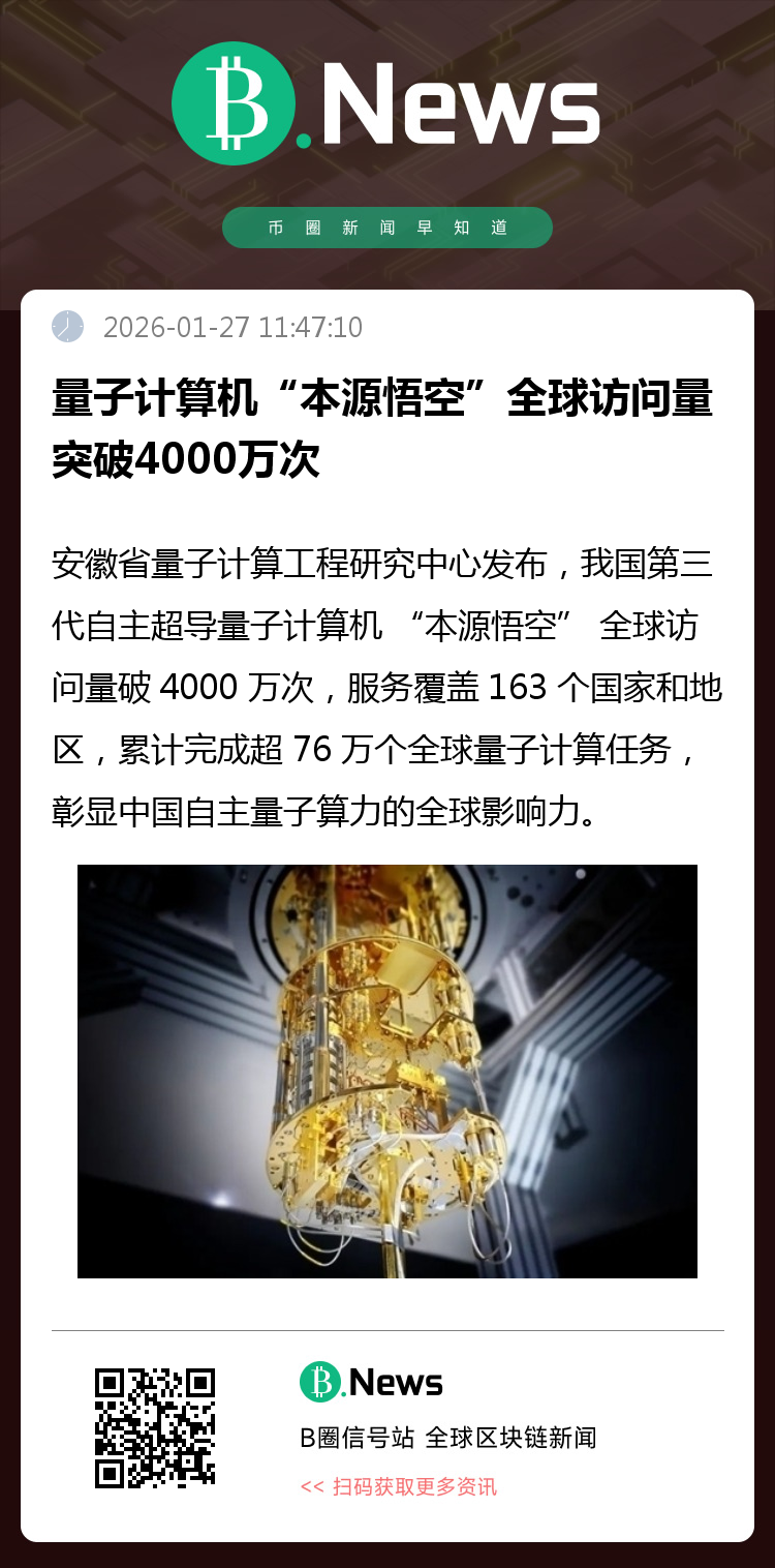 据安徽省量子计算工程研究中心最新发布,我国第三代自主超导量子计算机“本源悟空”全球访问量正式突破4000万次,服务网络覆盖全球163个国家和地区,标志着中国自主量子算力全球影响力持续提升。截至目前,“本源悟空”累计完成超76万个全球量子计算任务。(来源:财联社)