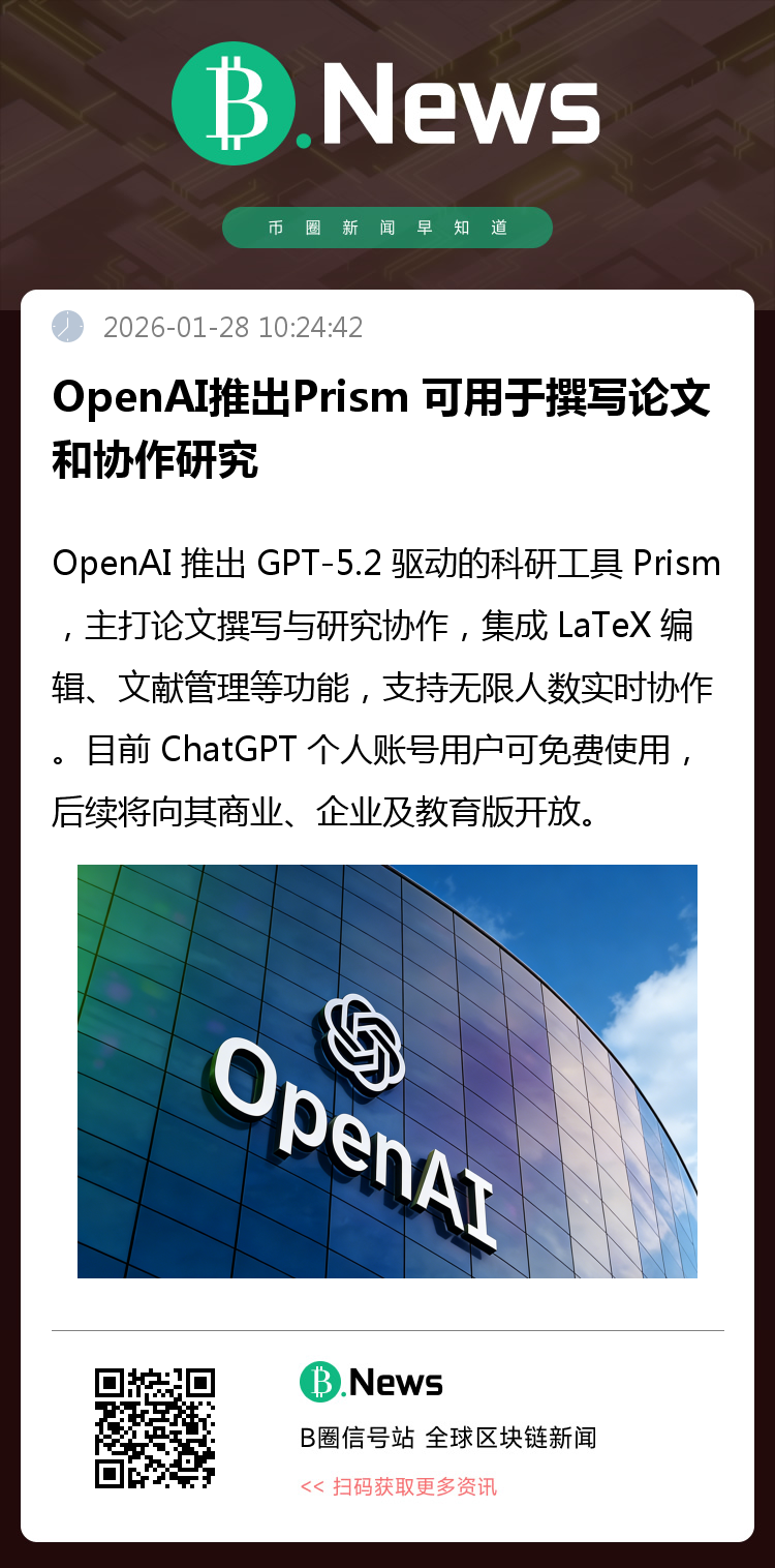 OpenAI宣布推出科研工作工具Prism,其由GPT-5.2驱动,可供研究者撰写论文和协作研究。即日起任何拥有ChatGPT个人账号的用户均可免费使用,后续将面向ChatGPT Business、Enterprise和Education开放。(来源:财联社)