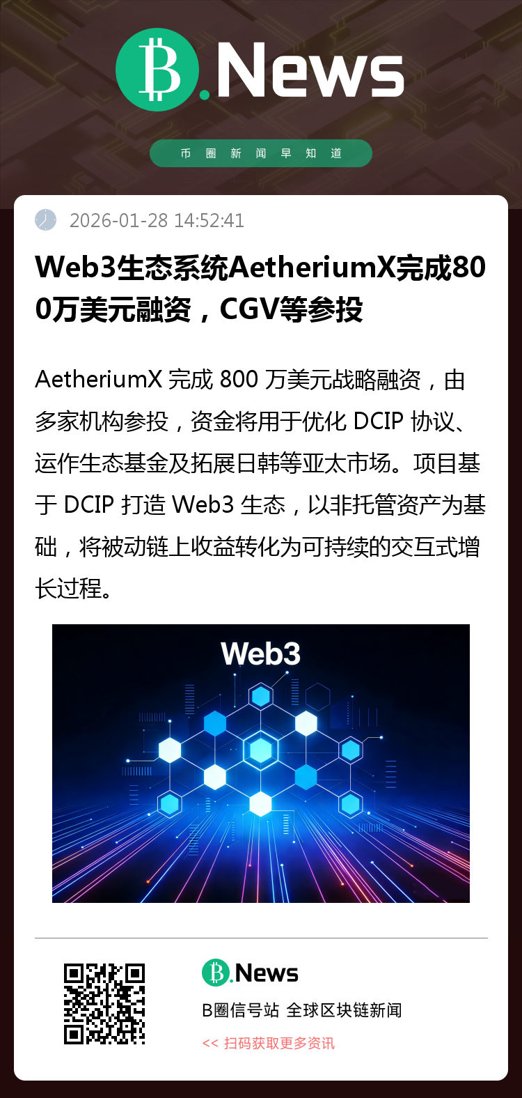 基于分布式资本智能协议(DCIP)构建的项目 AetheriumX 今日宣布完成 800 万美元 战略融资,本轮融资由 CGV、GAINS Associates、DuckDAO 及 Genesis Capital 参投,标志着 AetheriumX 正式进入以生态驱动增长为核心的战略阶段。新筹集的资金将主要用于加速其生态系统的开发与拓展,重点聚焦以下领域: