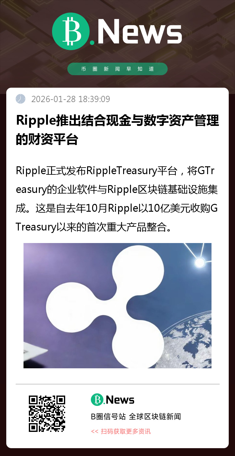 Ripple正式发布RippleTreasury平台,将GTreasury的企业软件与Ripple区块链基础设施集成。这是自去年10月Ripple以10亿美元收购GTreasury以来的首次重大产品整合。