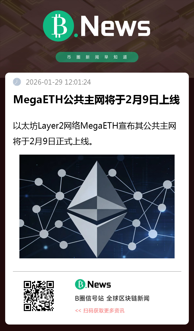1月29日消息,据CoinDesk报道,以太坊Layer2扩容网络MegaETH正式对外确认,其公共主网定于2月9日上线。该项目致力于打造以太坊的“实时”区块链,主打超低延迟与海量交易处理能力,旨在为去中心化交易所、链游等高频交互的消费级应用提供底层支持。(来源:CoinDesk)