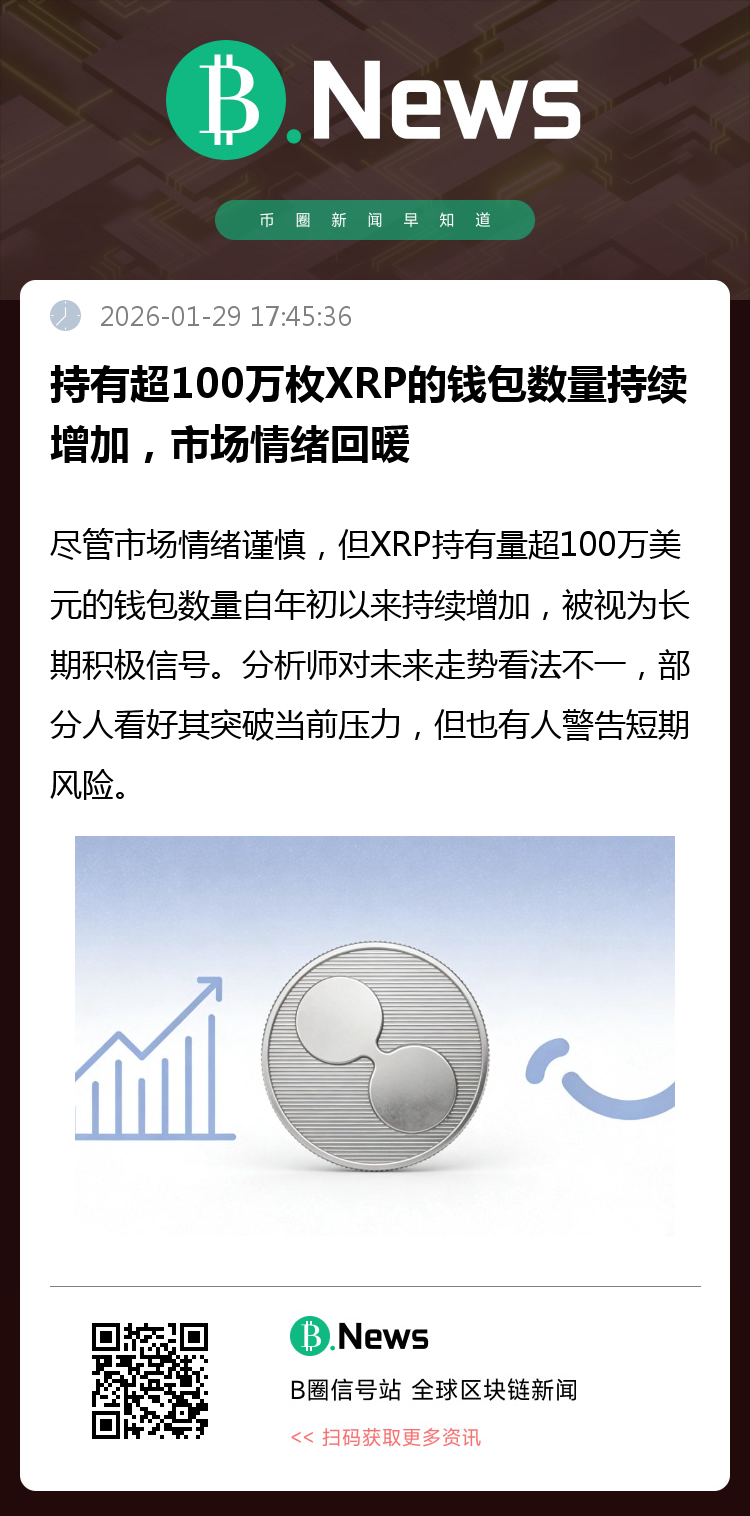 据Cointelegraph报道,尽管整体加密市场情绪偏谨慎,但持有超过100万枚XRP的“巨鲸”钱包数量却在增加。Santiment数据显示,自2026年初以来,这些“百万美元”钱包的数量一直在上升。