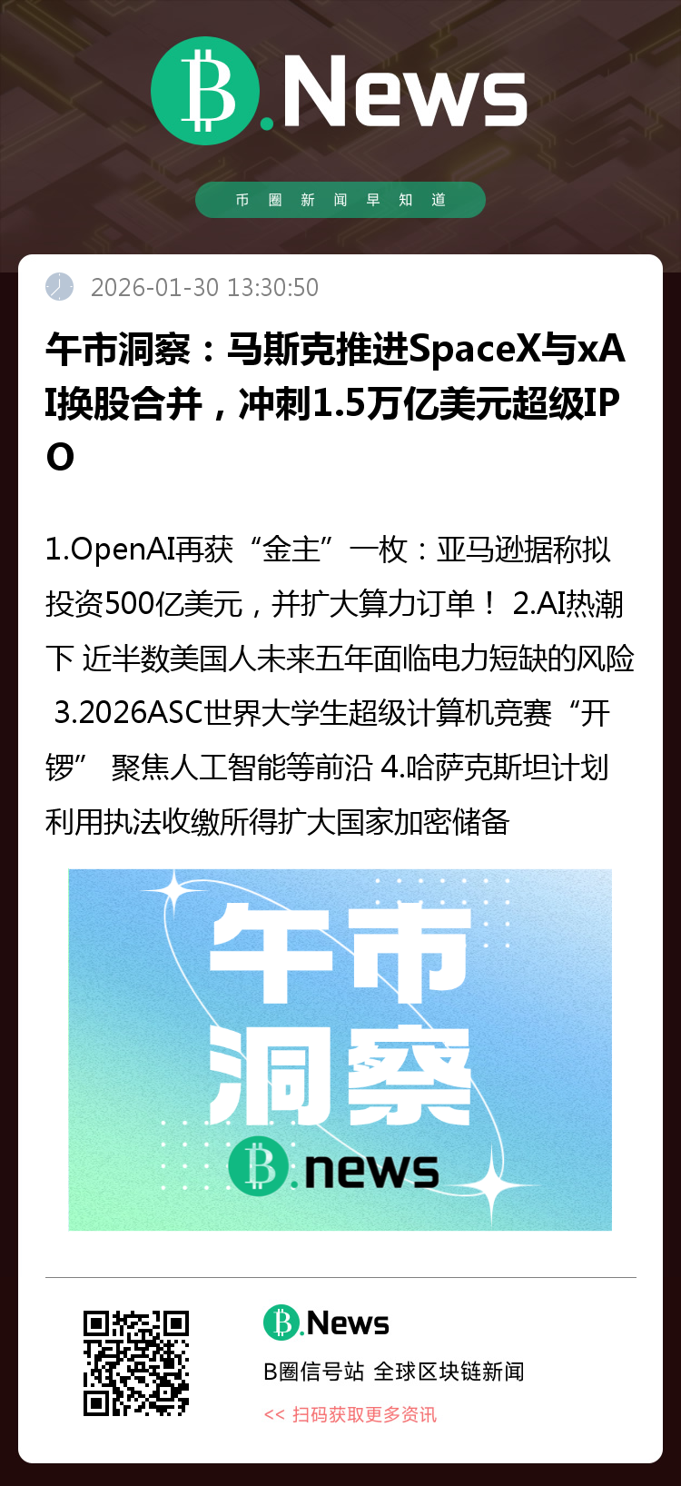 据路透社援引知情人士消息,马斯克正推动通过换股方式将 SpaceX 与 xAI 合并,为 SpaceX 计划中的重磅 IPO 做准备。交易尚未最终签署,但马斯克已在内华达州设立并购实体,显示整合进入实质阶段。