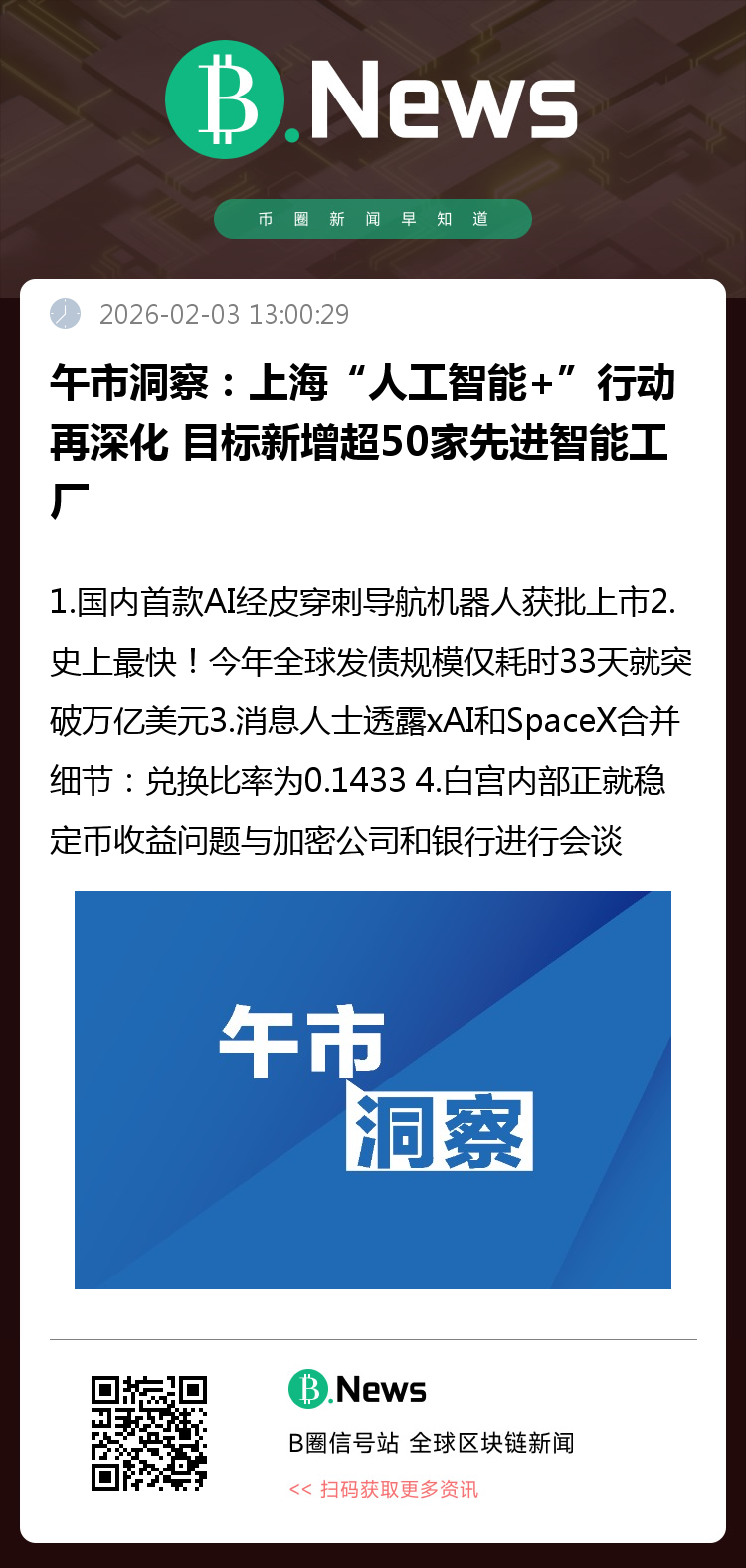 上海市第十六届人大四次会议2月3日上午在世博中心开幕。上海市市长龚正作《政府工作报告》。报告指出,今年要深入实施“人工智能+”行动,加强算力设施、行业语料、垂类模型等布局建设,推动新一代智能终端、智能体等广泛运用,加快重点产业智能化改造,新增50家以上先进智能工厂,积极培育智能原生新模式新业态。 (上观新闻)