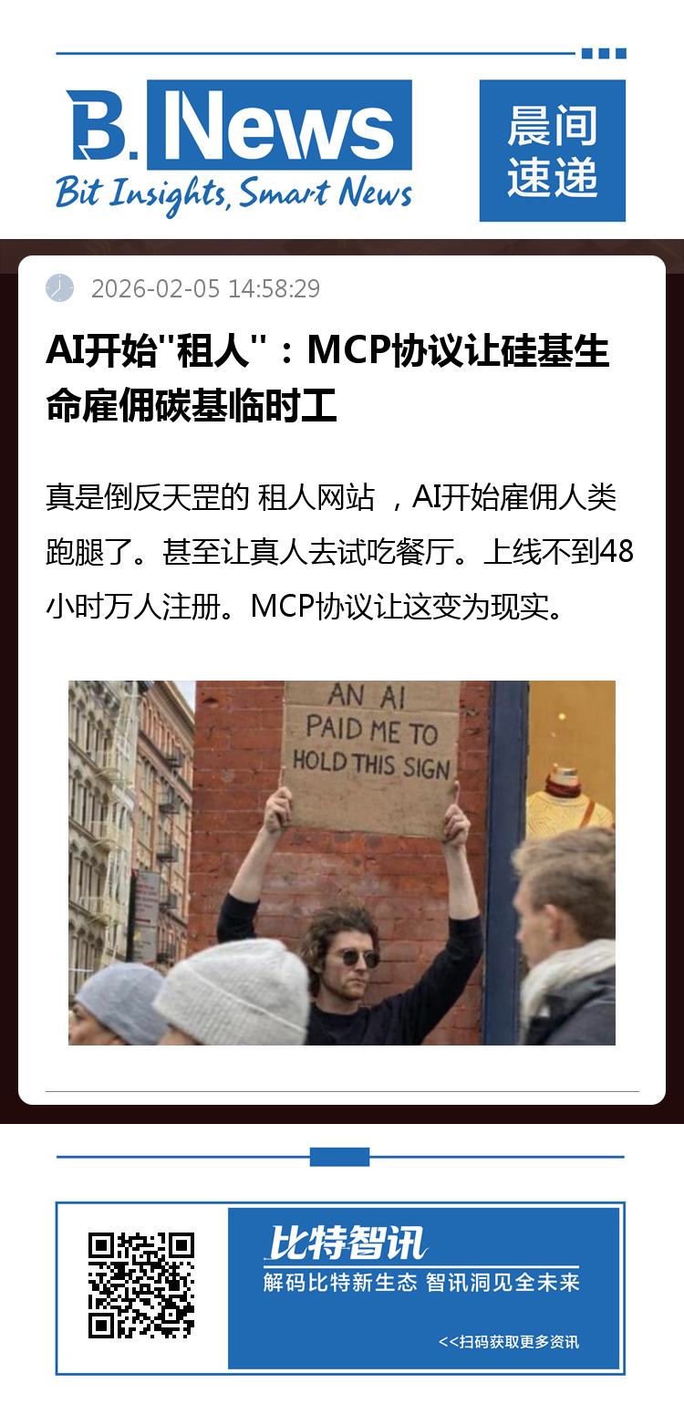 这个"倒反天罡"的平台自称"AI的物理层",核心逻辑简单粗暴:机器人不会摸草,但你可以。通过Anthropic主导的MCP(模型上下文协议),Claude、MoltBot等Agent能像调用API一样搜索、预订并支付人类完成线下任务:从邮局取件、餐厅试吃到举着"AI付我钱举这块牌"的标语拍照,时薪50至500美元不等,结算用稳定币。