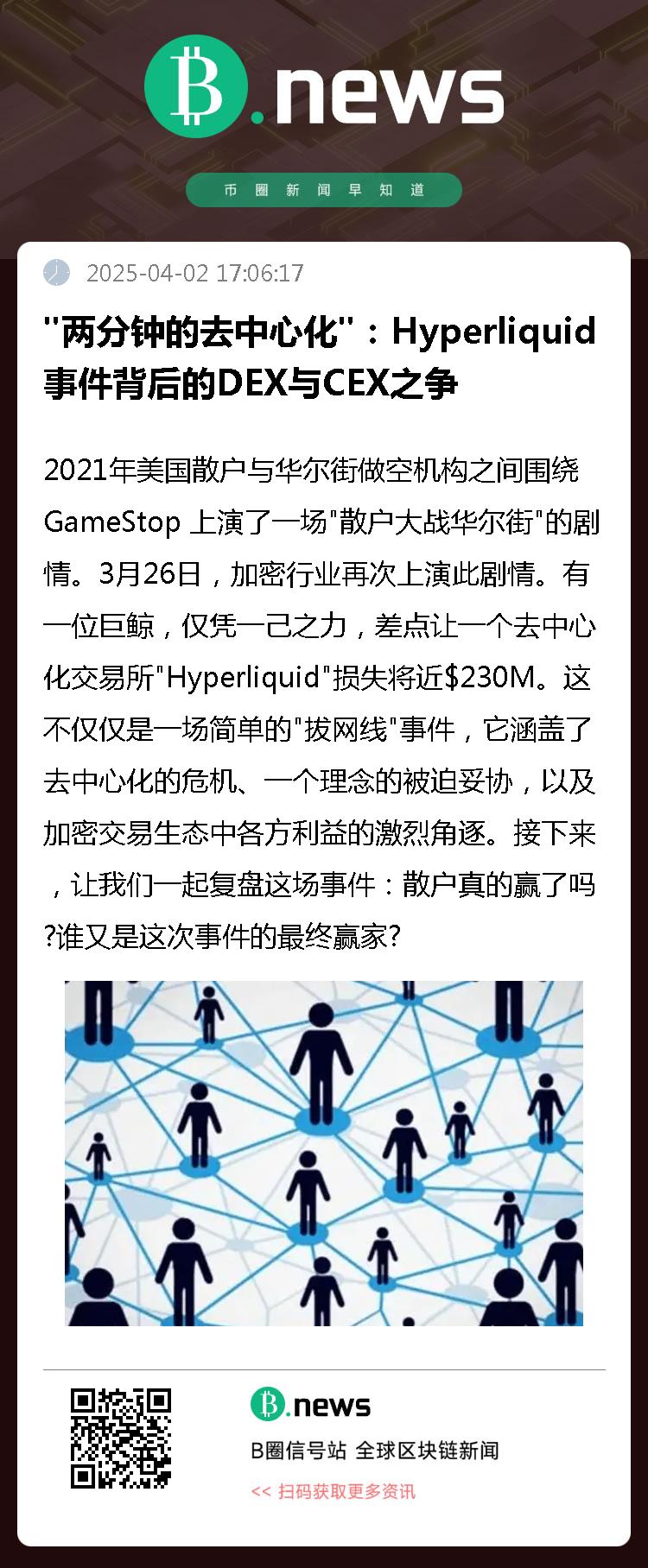 2021年美国散户与华尔街做空机构之间围绕 GameStop 上演了一场"散户大战华尔街"的剧情。3月26日,加密行业再次上演此剧情。有一位巨鲸,仅凭一己之力,差点让一个去中心化交易所"Hyperliquid"损失将近$230M。