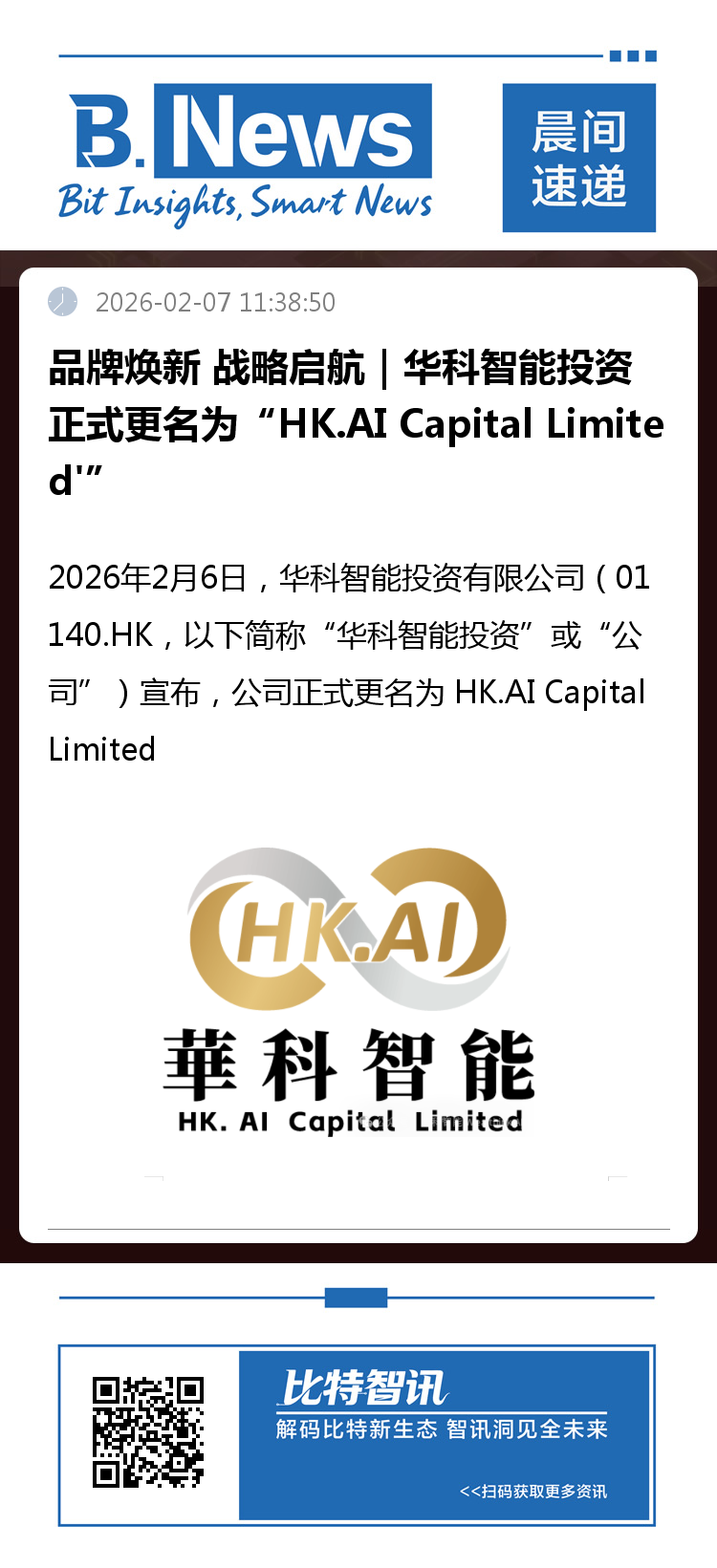 2026年2月6日,华科智能投资有限公司(01140.HK,以下简称“华科智能投资”或“公司”)欣然宣布,公司正式更名为 HK.AI Capital Limited,英文股份简称将由 "WEALTHINK AI"更改为 "HK.AI Capital",中文股份简称”华科智能投资”维持不变。