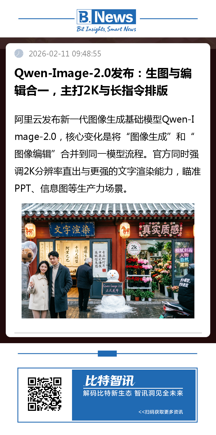 (图片来源:Qwen)据官方介绍,Qwen-Image-2.0支持“生图编辑二合一”,同一模型可覆盖文生图与图生图任务,并在AI Arena的盲测对比中取得较优表现。官方给出的示例包括直接生成“发展历程PPT页”、多层结构信息图,以及带“画中画”元素的组合版面。